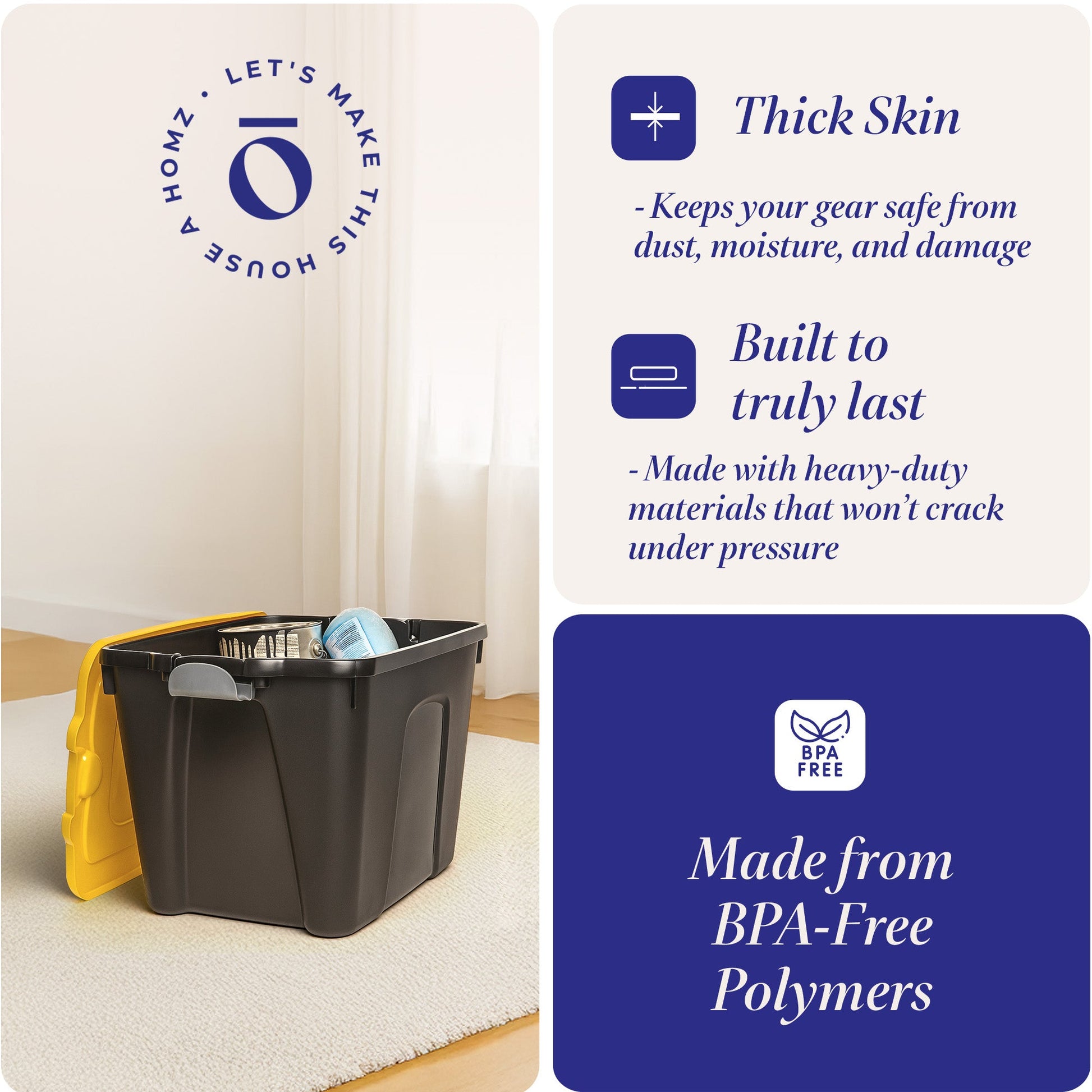 - Pack of (4) durable storage container bins with a spacious 22-gallon capacity each that provides ample room for storing a variety of items