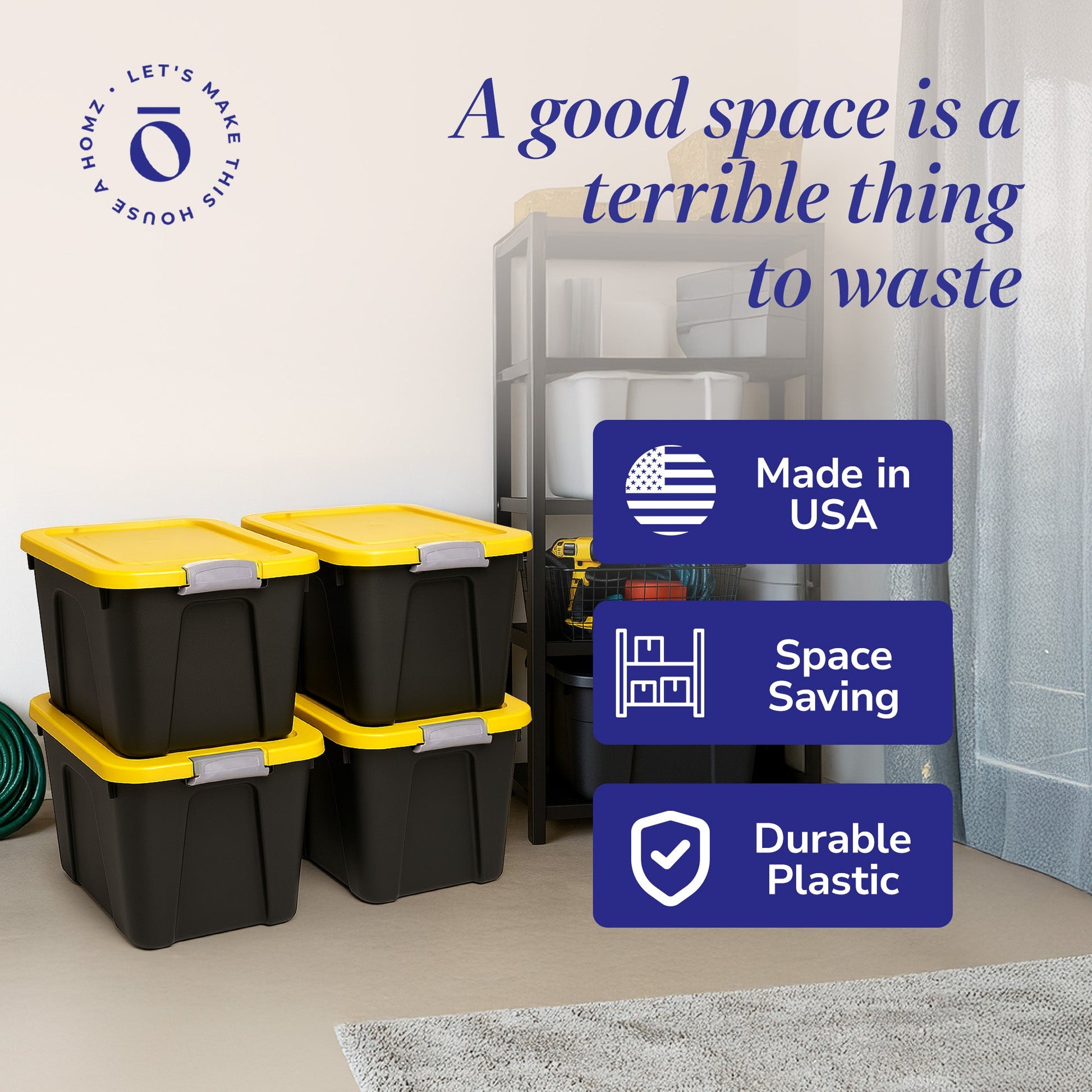 Whether you are cleaning and organizing your garage or looking for a convenient storage system for winter coats and holiday decor items, elevate your organizational prowess with this 4-pack of Homz 22-Gallon Durabilt Storage Containers.