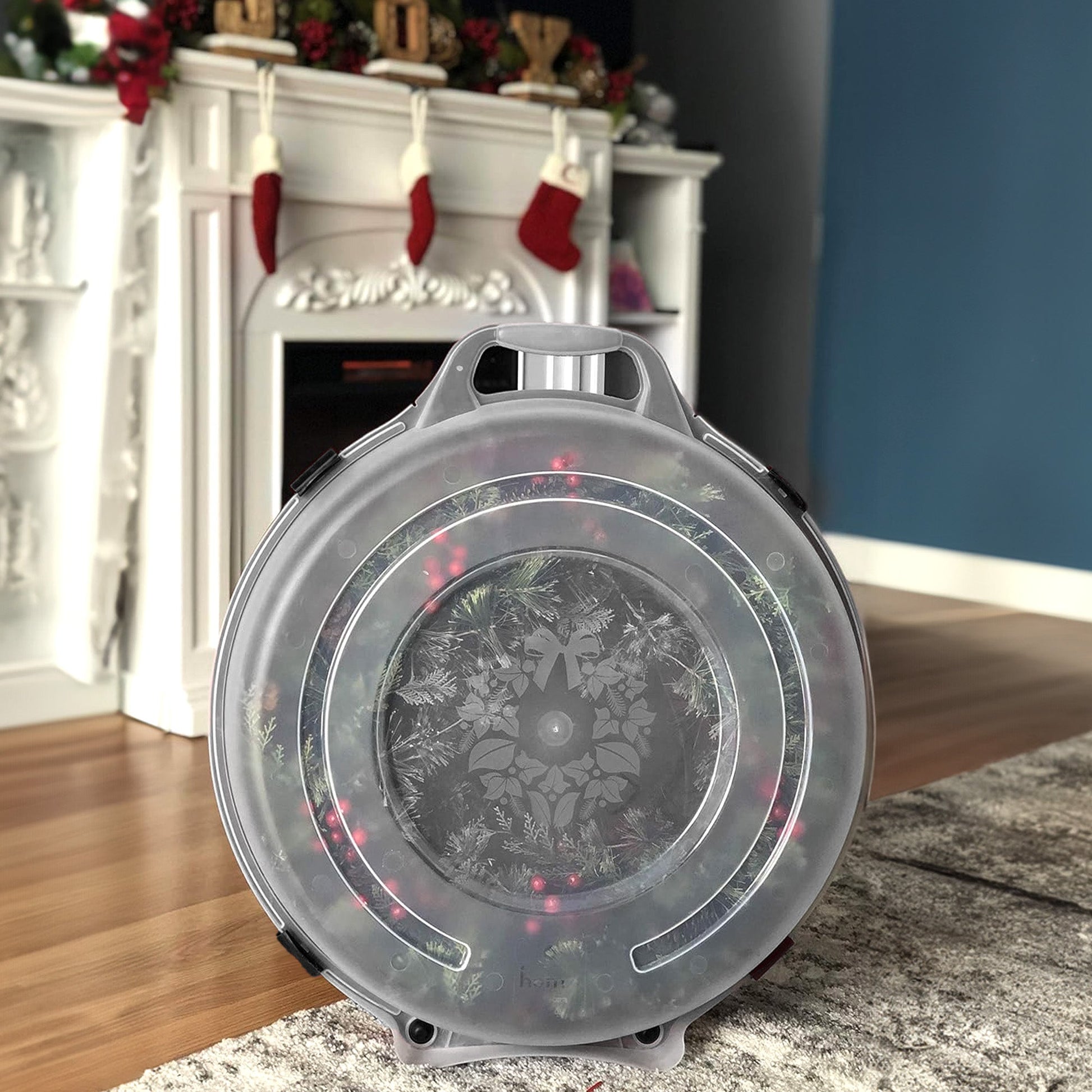 The holiday wreath storage containers are perfect for any winter or autumn wreaths up to 24 inches in diameter. The storage box will keep your holiday wreaths looking as good as new year after year, making them ideal for all seasons. With a see-through front lid, you can easily identify what's stored inside for a quick find of your decorations, while a built-in handle makes it easy to grab from out of the basement, attic, or shed.