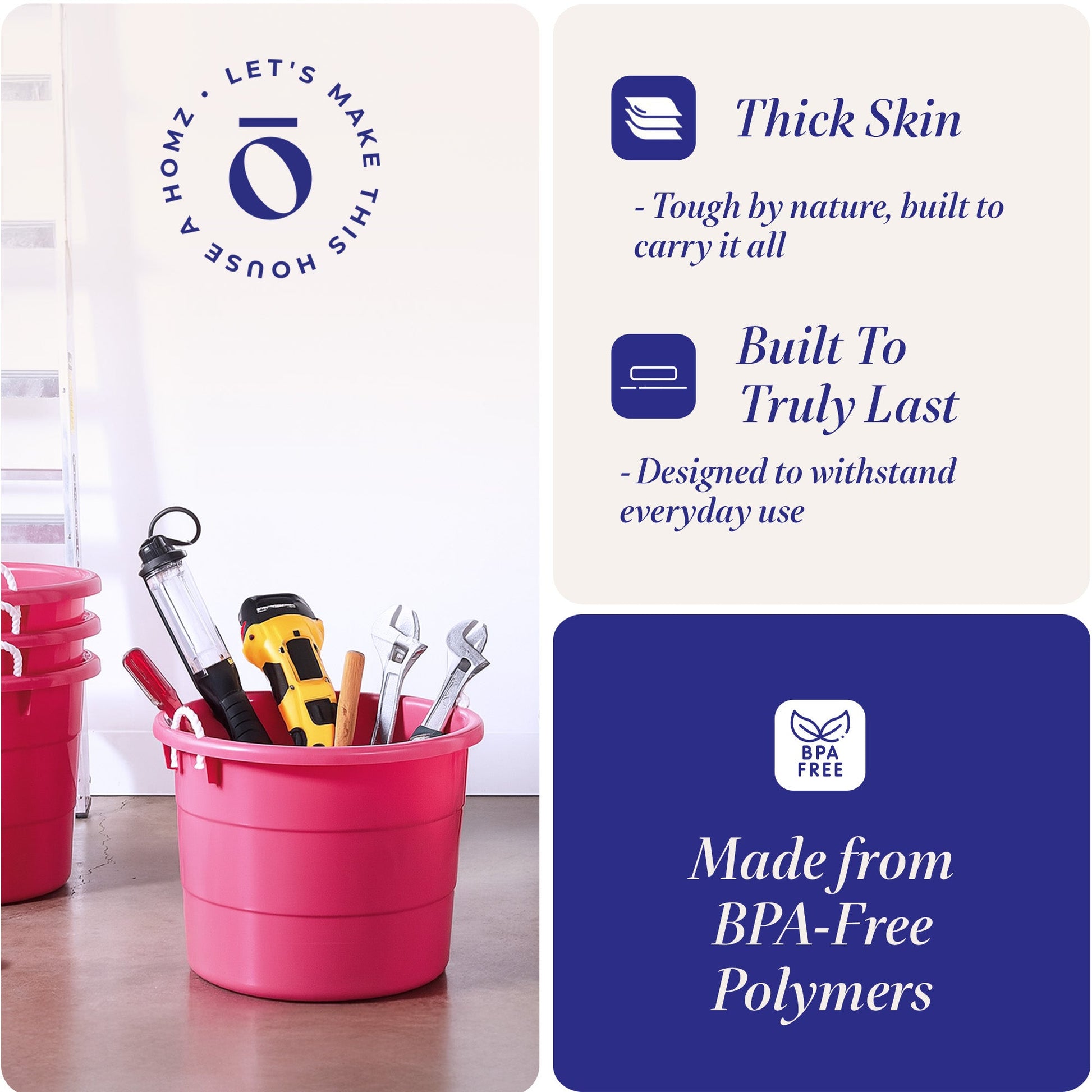 The durable plastic makes these storage buckets great for indoor and outdoor use. Easily carry the plastic buckets around with the nylon rope handles. When you're not using the storage buckets, you can nest other buckets inside of them for compact storage.