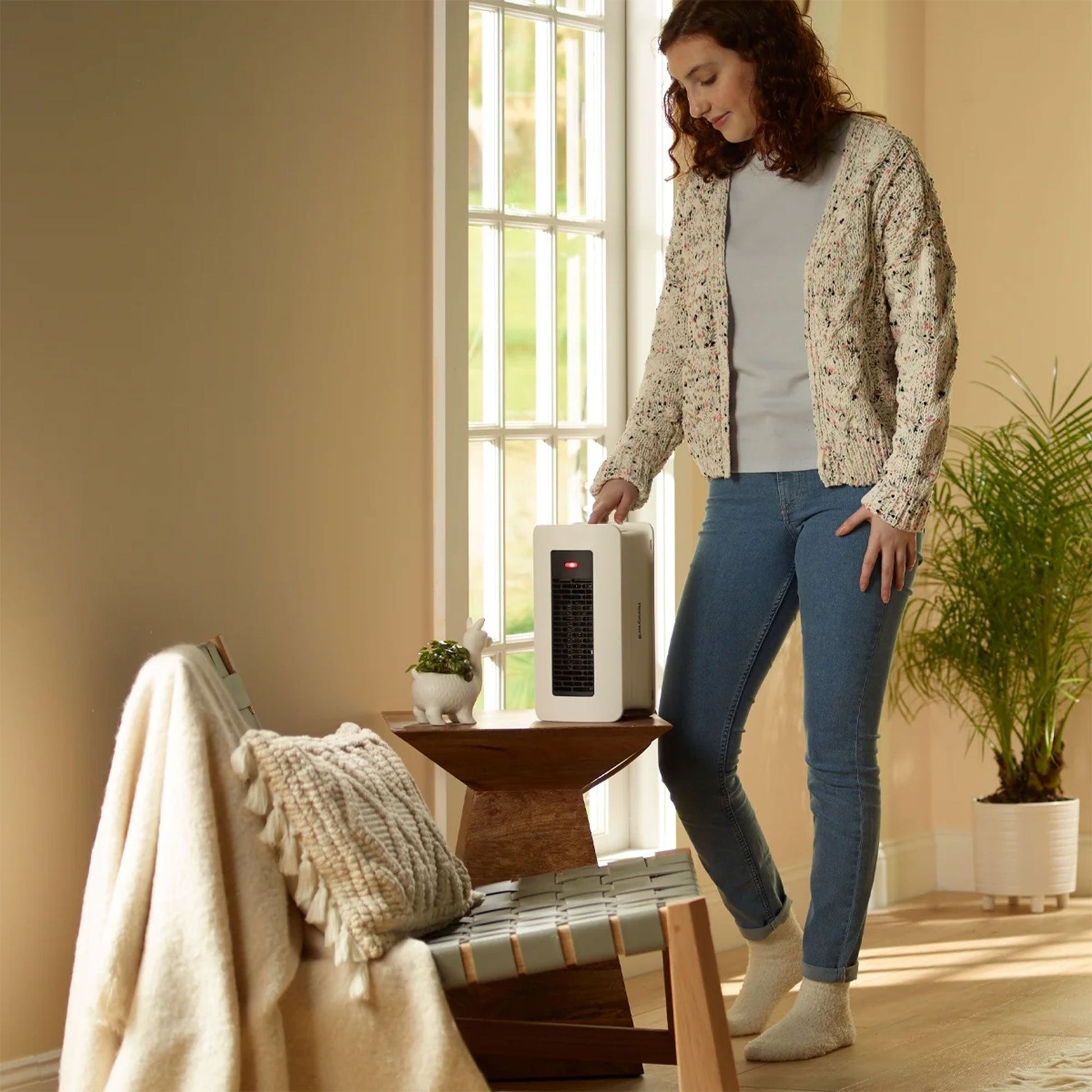 Designed to provide both heating and cooling, this compact heater and fan combo is ideal for bedrooms, offices, bathrooms, and more. Thanks to an innovative ALCI plug, this portable heater is safe for use in bathrooms. The unit can be positioned upright or sideways to fit perfectly in any room, offering flexible placement options. Equipped with intuitive touch controls, this space heater includes multiple safety features such as 3x Overheat Protection, ensuring peace of mind while in use. A recessed carry handle makes this home heating option easy to transport between rooms, while the convenient timer settings allow you to schedule heat for 30 minutes, 1 hour, or 2 hours. Whether you're looking to stay warm during the colder months or enjoy a refreshing breeze in summer, the fan-only setting allows for year-round comfort.