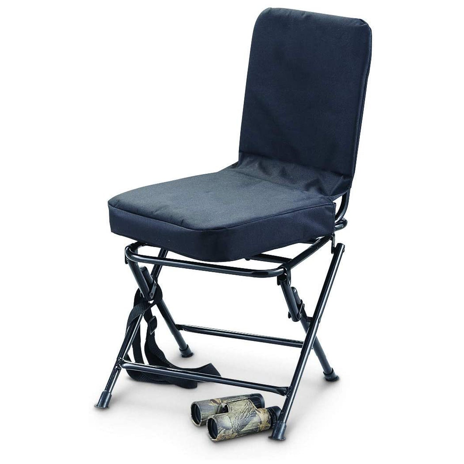 Easily monitor every side of your blind without giving away your position thanks to the 360-degree silent swivel on this ground chair. Boasting a thick 2.25-inch seat cushion and padded backrest, this stool offers all the support you need to lean back and perfectly line up your shot for an epic trophy on your next hunt. The powder-coated tubular steel frame stands strong to hold hunters up to 300 pounds, yet weighs just 11 pounds, so you can easily fold the legs up for effortless transport and storage. Sling the adjustable carrying strap over your shoulder for even easier portability before you set up camp or as you track prey.