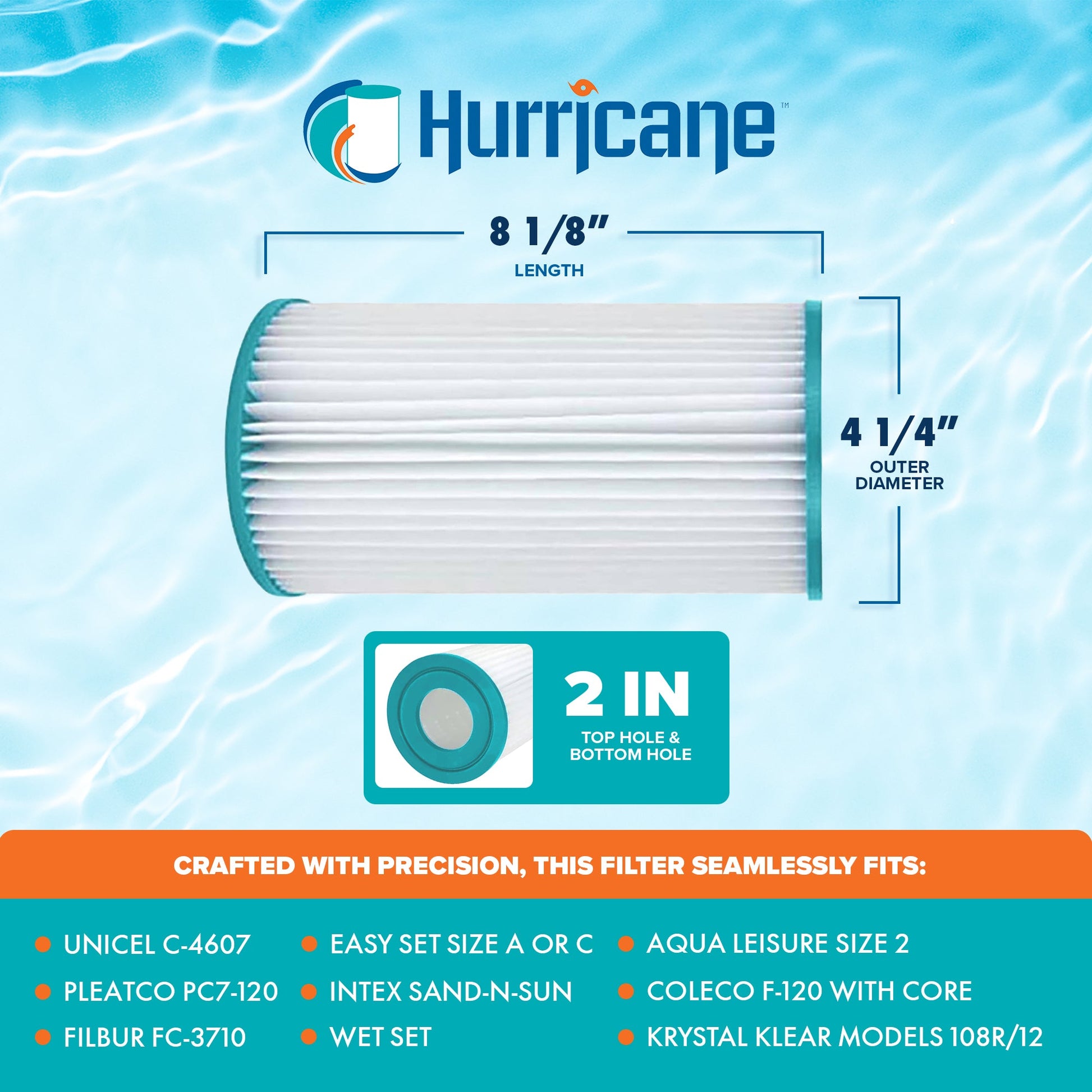Dive into pristine waters with the Hurricane HF4607-02 Advanced Cartridge Filter, where unparalleled cleanliness awaits. Crafted with meticulous precision, this filter guarantees seamless compatibility with Unicel: C-4607, PC7-120, Filbur FC-3710, Coleco F-120 with core, Sand-n-Sun, Easy Set Size A or C, Wet Set, Aqua Leisure Size 2, Krystal Klear Models 108R/12, and other compatible models. With dimensions measuring 8.13 inches in length, an outer diameter of 4.25 inches, a top hole of 2 inches, and a Bottom hole of 2 inches, achieving an ideal fit with this filter cartridge is effortless, measure your current filter for a flawless match.
