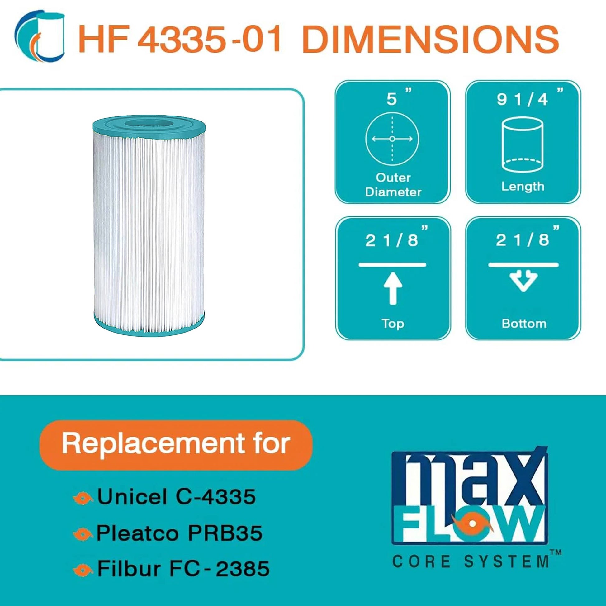 Dive into pristine waters with the Hurricane HF4335-01 Advanced Cartridge Filter, where unparalleled cleanliness awaits. Crafted with meticulous precision, these filters guarantee seamless compatibility with Pleatco PRB35-IN, Unicel C-4335, Filbur FC2385, Dynamic Series IV - DFM, DFML, Waterway 35 In-Line, Guardian 409-219, Filbur FC-2385, 03FIL1300, 17-2482, 25393, 303557, 817-3501, R173431, and other compatible models. With dimensions measuring 9.25 inches in length, an outer diameter of 5 inches, a top hole of 2.13 inches, and a bottom hole of 2.13 inches, achieving an ideal fit with these filter cartridges are effortless, measure your current filter for a flawless match.
