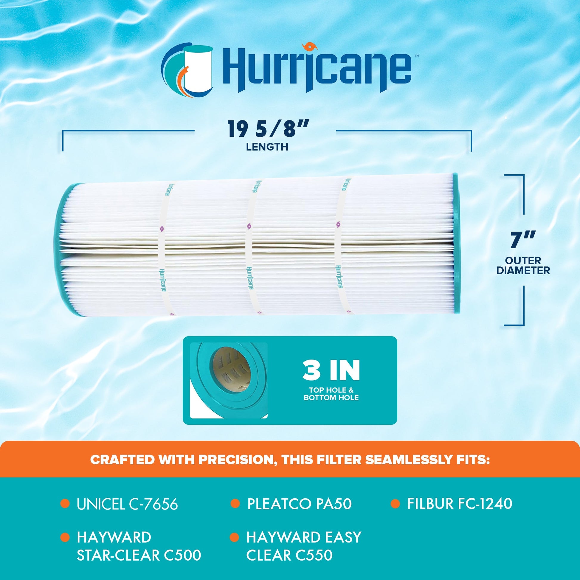 Dive into the realm of pristine waters with the Hurricane HF7656-01 Advanced Cartridge Filter, where unparalleled cleanliness awaits. Crafted with meticulous precision, this filter guarantees seamless compatibility with a range of models including Unicel C-7656, PA50, Filbur FC-1240, Hayward Star-Clear C500, Hayward Easy Clear C550, Pentair Purex CF-50, and other compatible models. With dimensions measuring 19.75 inches in length, an outer diameter of 7 inches, and top and bottom holes being 3 inches, achieving an ideal fit is effortless, measure your current filter for a flawless match.