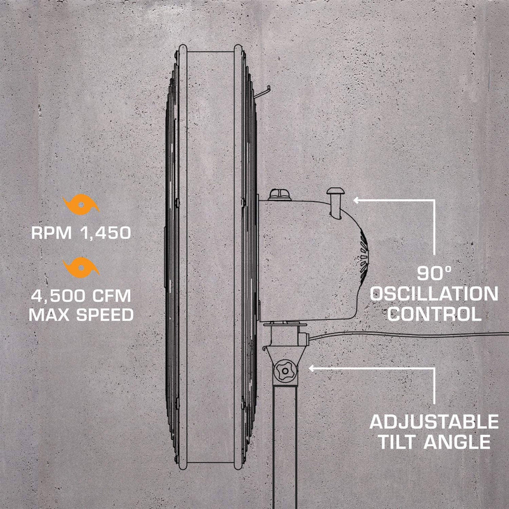 These portable fans are powerful, circulating air in various large spaces, from homes to garages, gyms, warehouses, and workshops. 3-speed settings let you adjust the fan to suit your space without losing its high-velocity power while the adjustable height from 39 to 54 inches accommodates any space. Running at 4,500 CFM and 1,450 RPM, these floor fans are serious about delivering a refreshing atmosphere paired with the oscillating feature to provide optimal coverage. Its adjustable tilt feature also makes directing air easy, reaching every corner. Whether in a bedroom, basement, or indoor garden, it effortlessly fits into any space, always ready to provide a breath of fresh air. These versatile wonders come complete with a generous 6-foot, 120-volt power cord for ample reach and easy plug-in use.