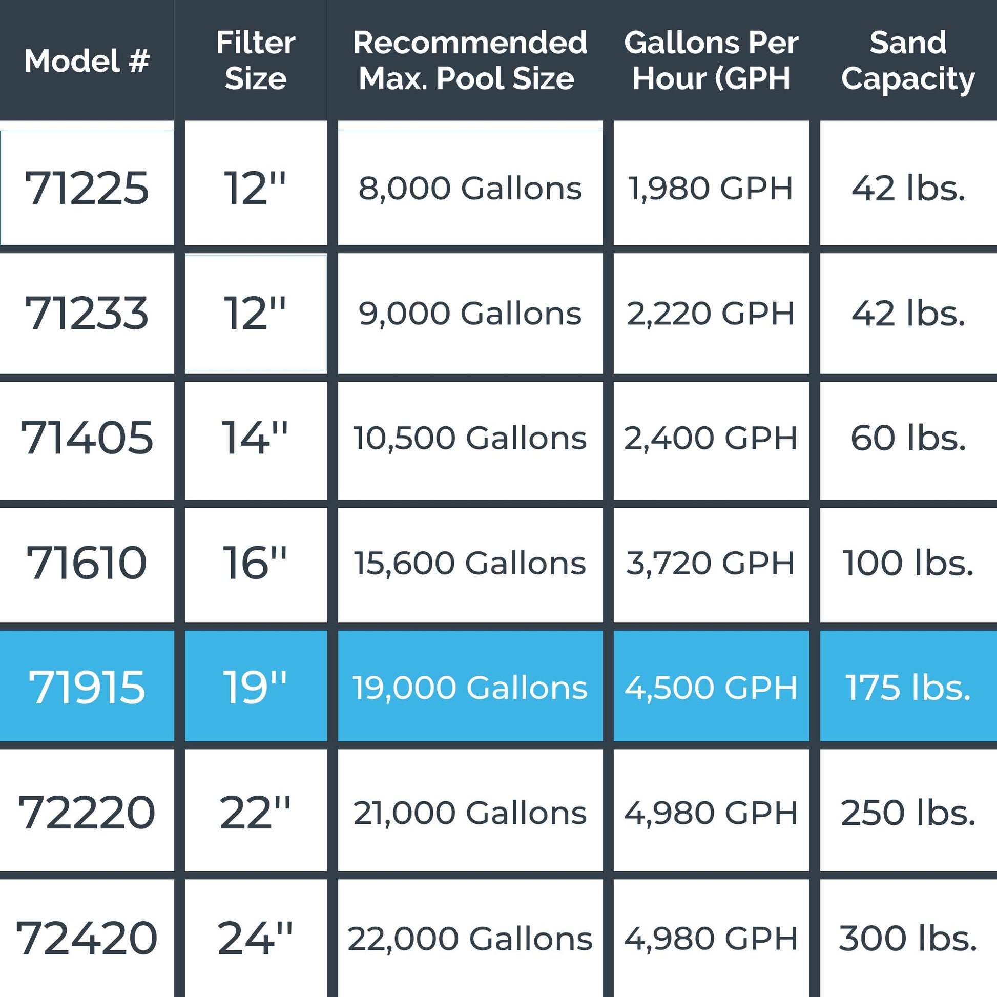 - Double-reinforced 19-inch molded tank can hold up to 175 pounds of sand, perfect for pools up to 19,000 gallons; Sand not included