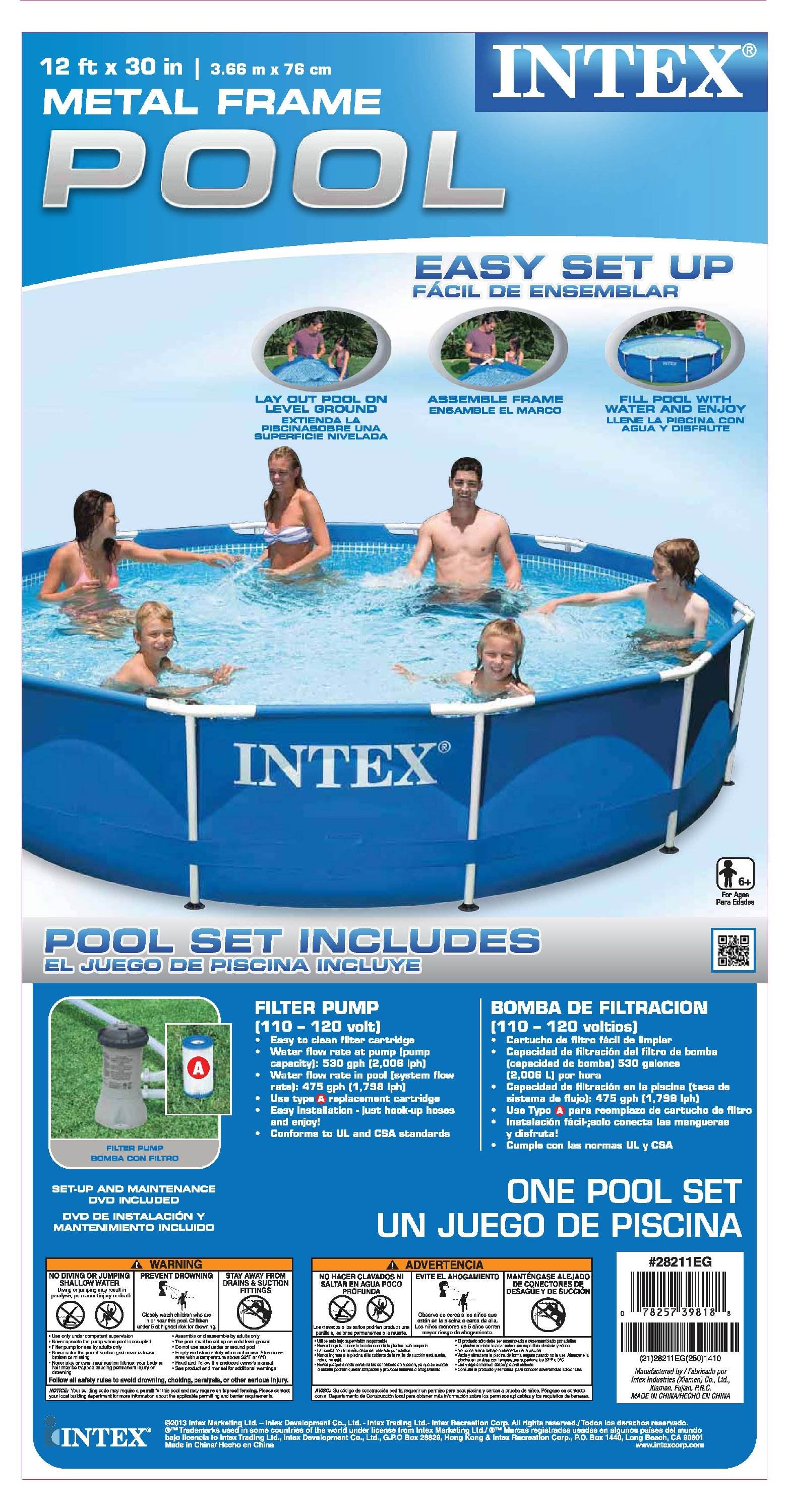 The Intex Metal Frame Set Pool is a pool 12 feet in diameter and 30 inches tall and is great for making a splash in the warm weather. Easy to assemble and maintain, this pool is great for having friends and family enjoy time outdoors.