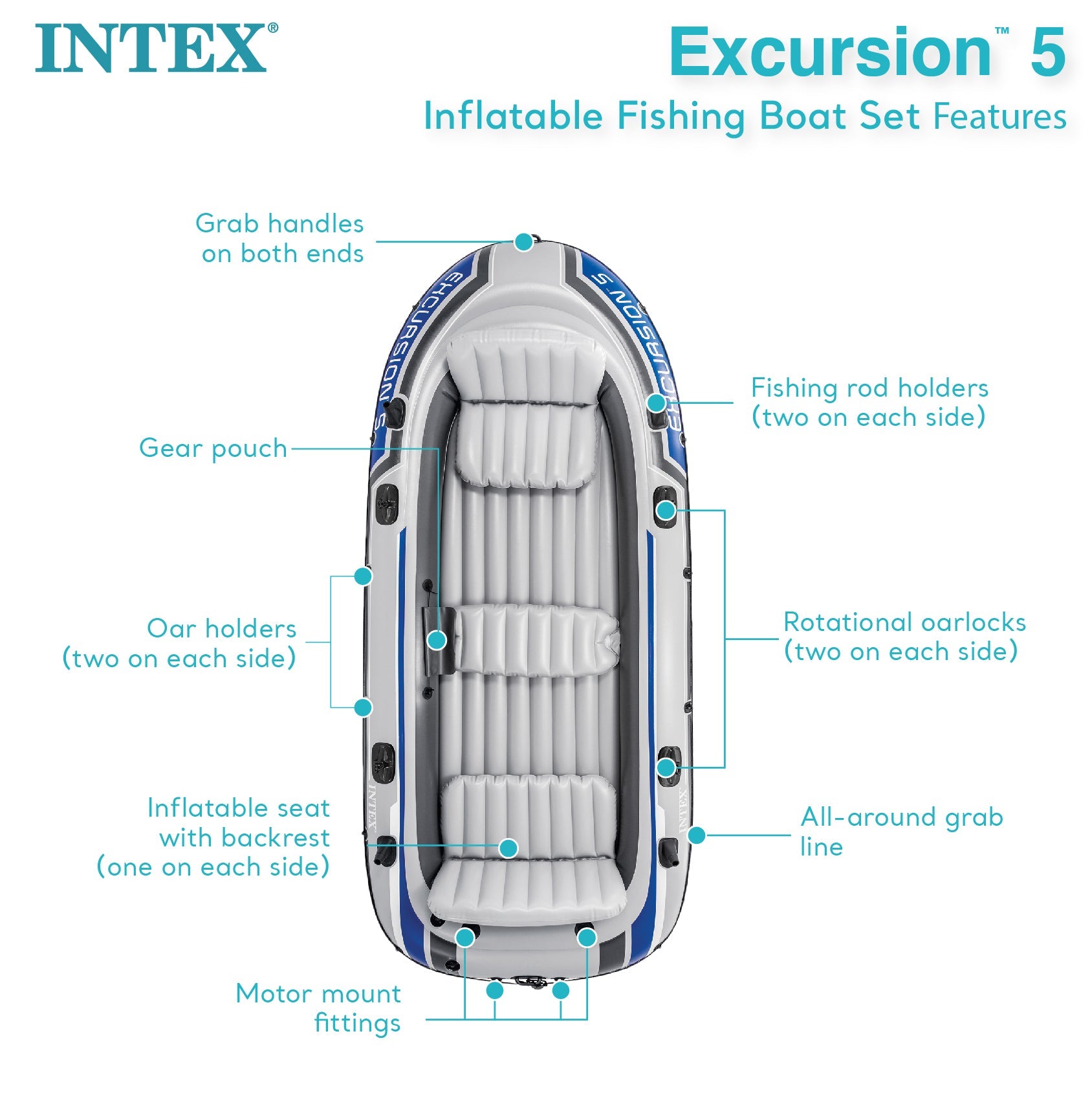- Includes an Excursion 5-Person Inflatable Boat Set with 12v Trolling Boat Motor and a Motor Mount Kit