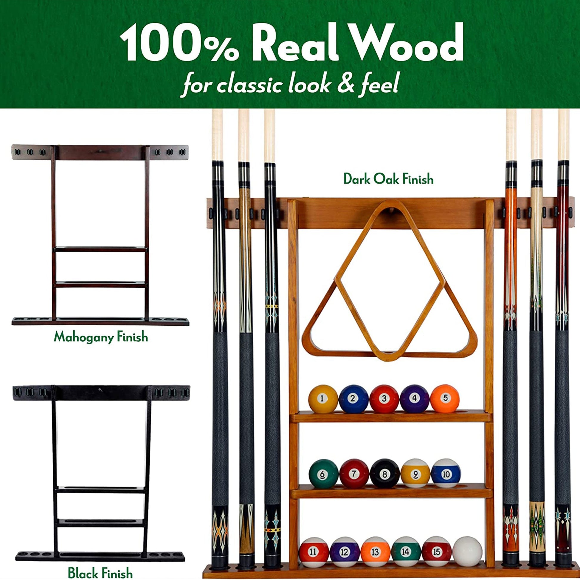 - Stylish and convenient way to keep your pool sticks and billiard balls organized, holds 6 cues and a full set of balls