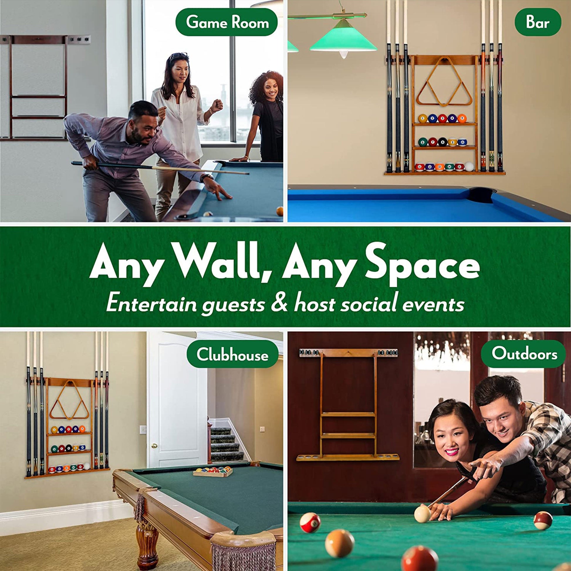 - Wall-mounted design allows you to neatly hang rack on the wall for easy access and adds to the aesthetic of pool room
