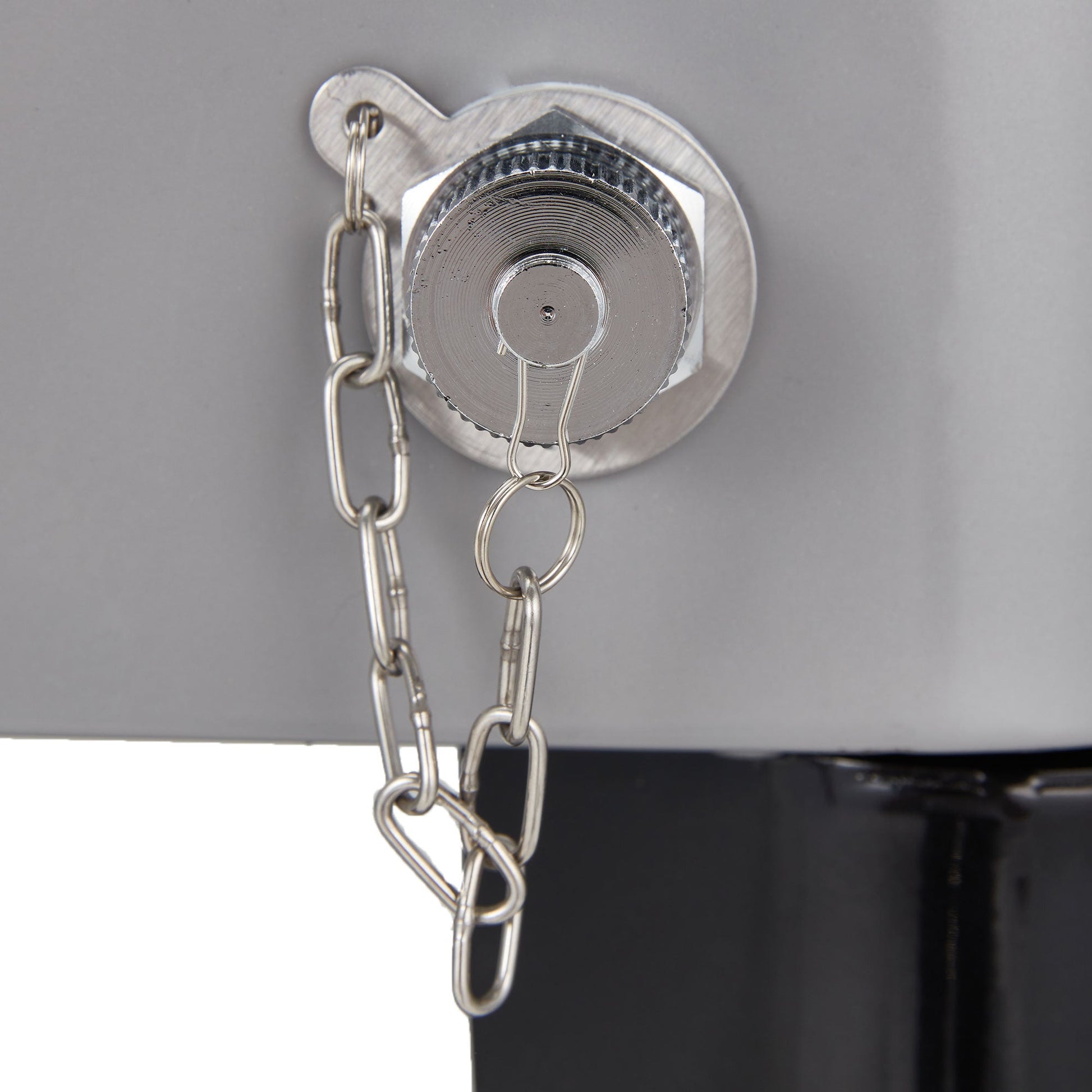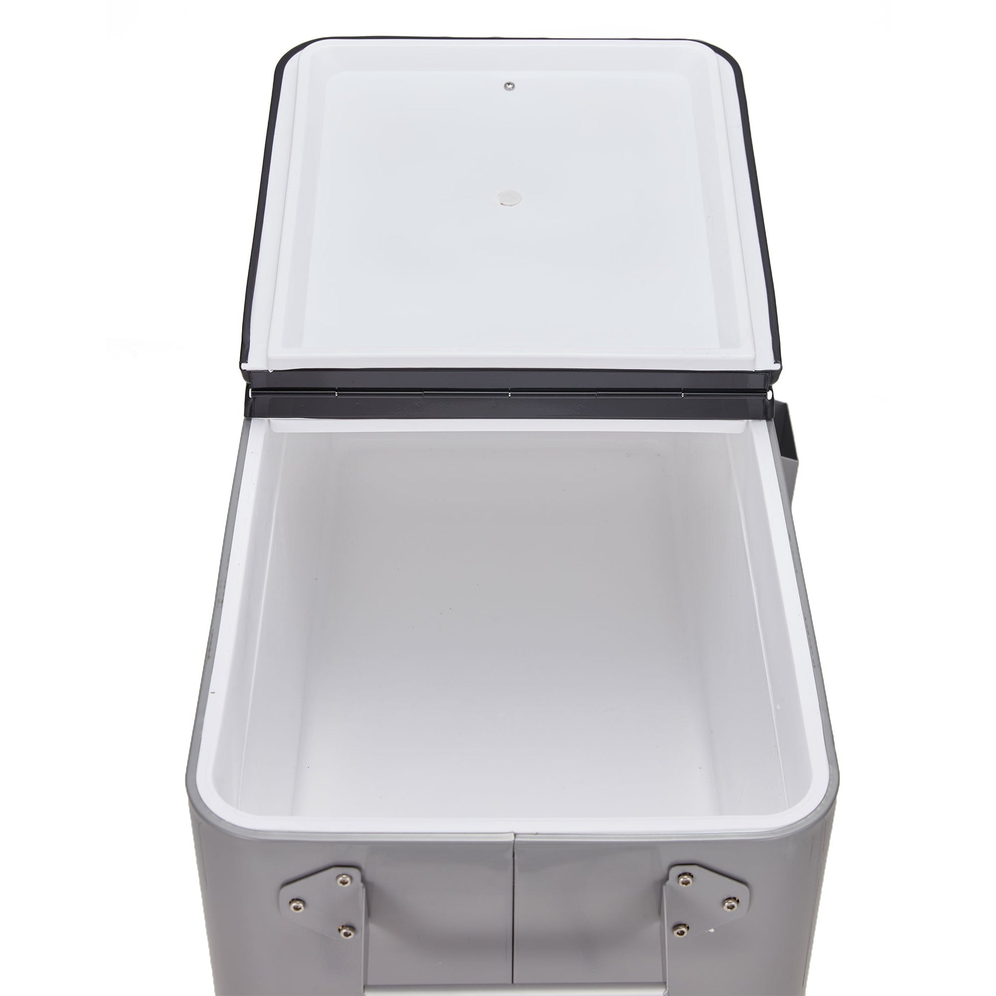 Holding up to 70 aluminum cans in the 80-quart (20-gallon) interior space, the cooler entertains guests by keeping drinks at an icy temperature. The raised design holds beverages at a convenient height, and the bottom shelf provides extra space for storing refills or carting other items outside. Easily pop open bottles with the integrated bottle opener and never worry about waste as the cap catcher grabs falling caps for effortless cleanup. Ready for your next party, the cooler moves anywhere with the integrated rolling wheels, with 2 locking wheels for easy stabilization, letting you position the beverages wherever they're most needed. The cooler features a handy drainage hole plug in the back, for removing excess water from the cooler easily at the end of the day.