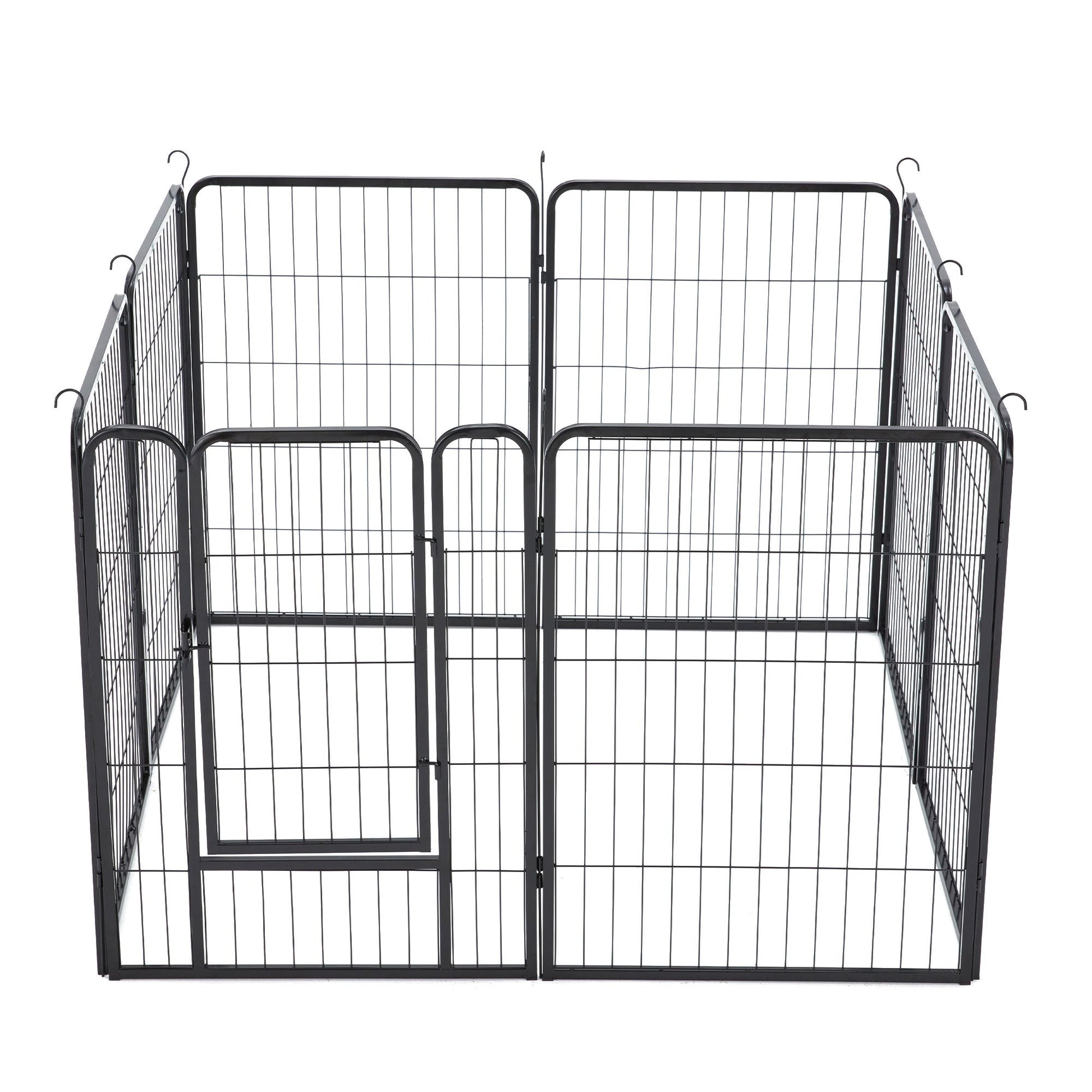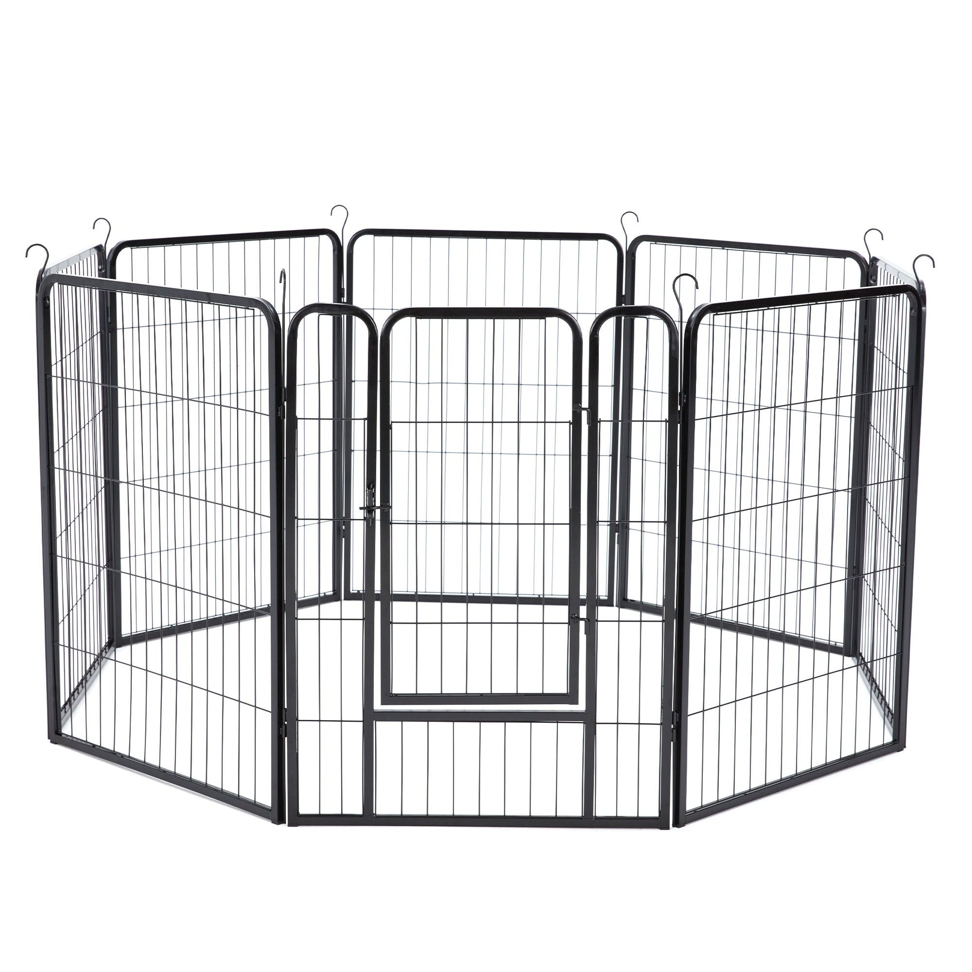Measuring 32 inches high by 24 inches wide, each of the 8 panels is easily linked together for a simple and tool-free assembly. If you have more than 1 of these lightweight and fully collapsible 8-panel pens, you can easily move them around or merge them together for a roomier playpen and versatility with configurations. One of the panels integrates a lockable entry and exit door for easy access while training, feeding, or catching that crazy pup. The powder-coated metal construction protects against rust, making it ideal for camping, traveling, or setting up in the yard.