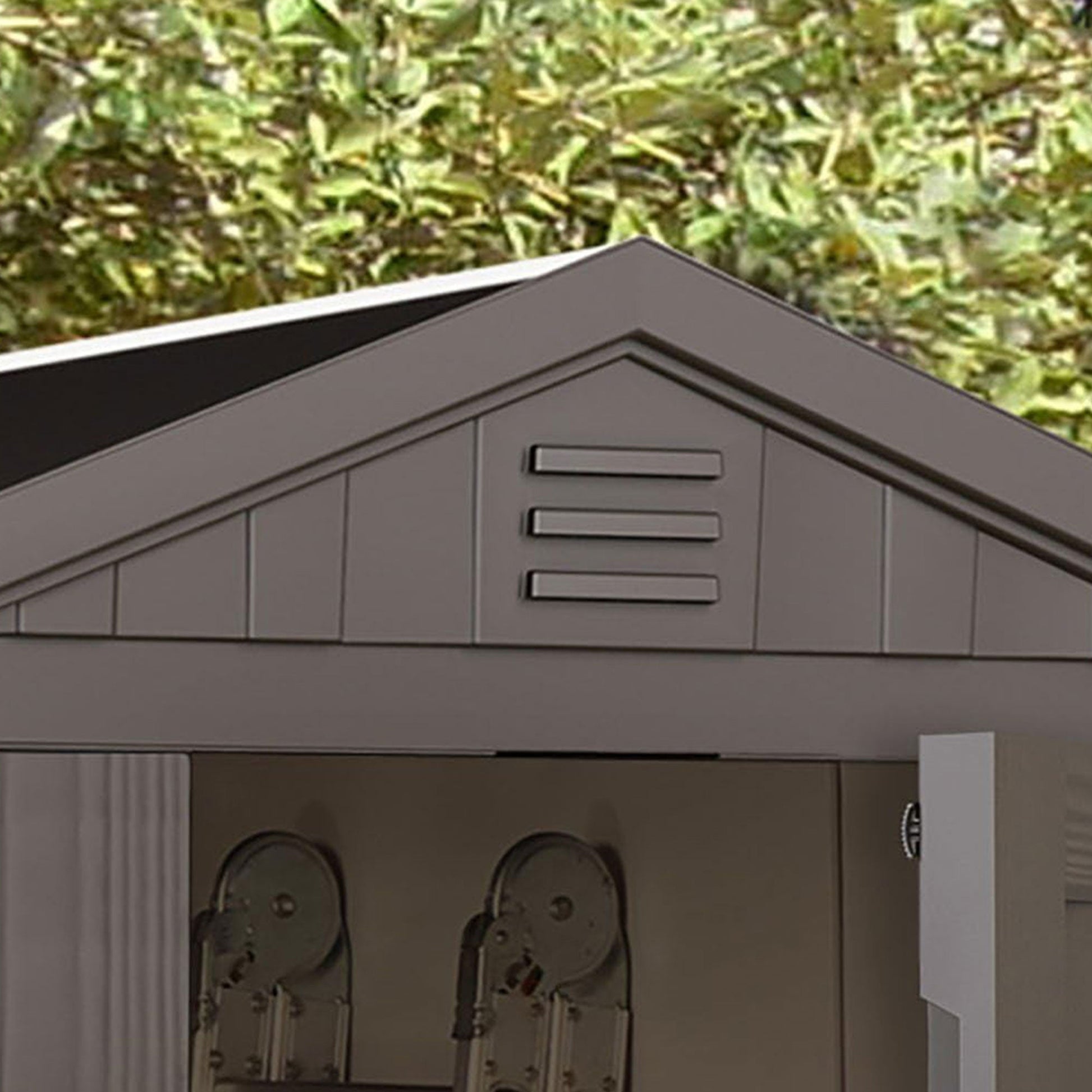 Designed with polypropylene durable resin, this shed is weather-proof and won't rust, rot, or decay as months go by. No need to sand or stain - just spray the exterior clean with a hose as needed. The included side window allows plenty of natural light to enter the garden shed, making all the contents easily visible. The spacious interior also features a ventilation grille that retains fresh air, minimizing any dampness, and protecting all your garden accessories.