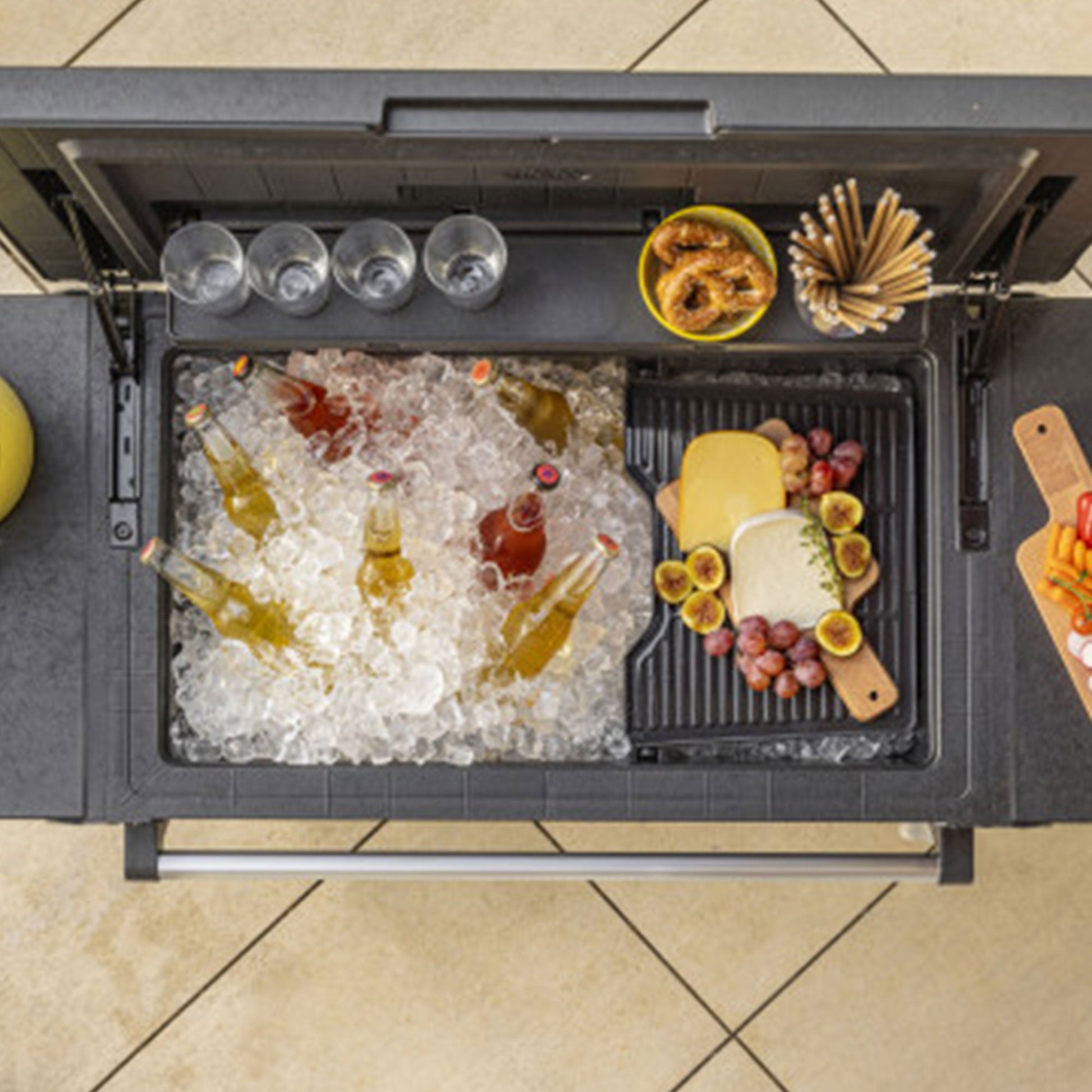 This drink cooler for parties features double-walled EVOTECH panels that add a touch of elegance with their wood-like appearance. The compact design features a folding top lid with easy-lift pistons, a convenient fold-down shelf for glasses and accessories, and two fold-out shelves on either side of the retro cooler for added serving space – it's your very own bar essential for parties outdoors.