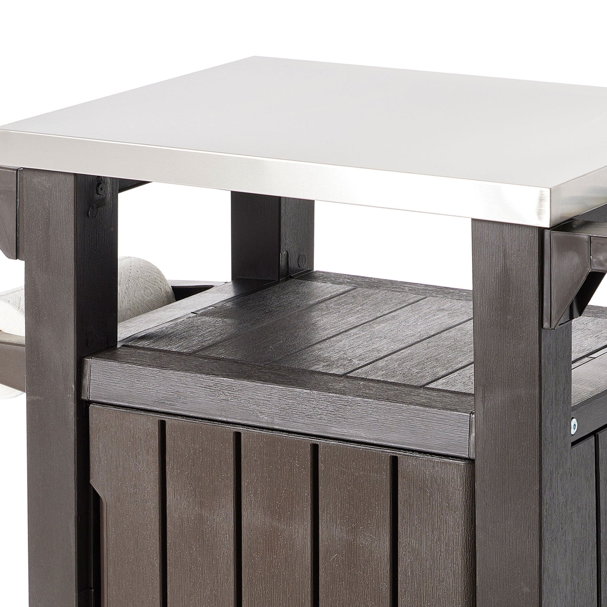 - Constructed of weather-proof polypropylene materials with a stainless steel countertop that offers efficient space that can support up to 66 pounds for long-lasting use