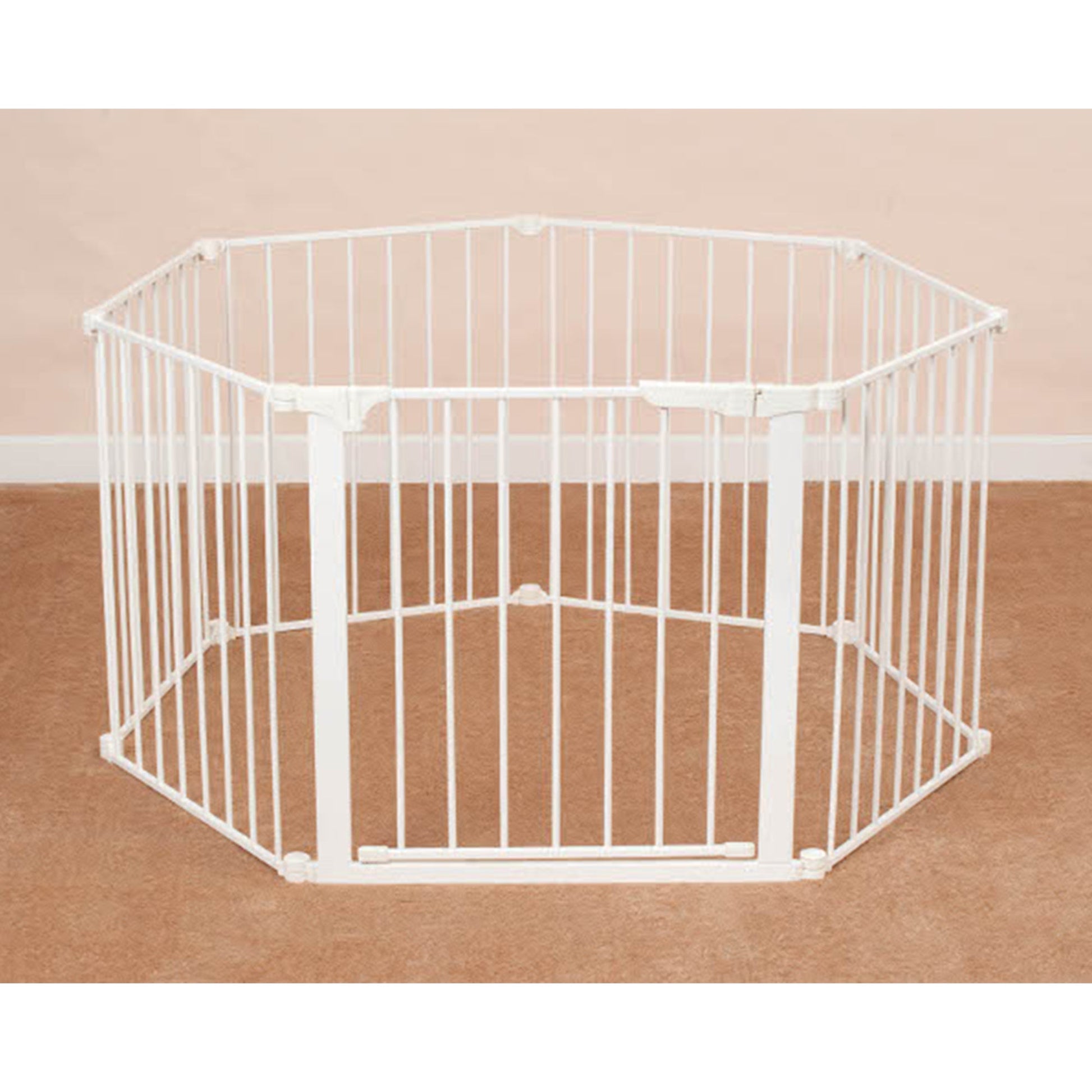 Constructed from heavy-duty steel, this ConfigureGate door was built to provide ultimate protection in any odd-shaped or extra wide area. All joints easily rotate and then lock into place for secure attachment. The unique handle design applies magnet-lock technology with a dual magnet design that automatically draws the door shut, closing the gate securely each time. With a hold-open feature, you can keep the door open until pushed back close. This 3-piece safety gate will fit up to an 86-inch opening with the ability to link an unlimited amount of 9-inch or 24-inch sections to fit any desired length or to make a free-standing enclosure for a baby playpen (Sold separately). Quick-release adjustable wall mounting hardware allows you to mount the gate if needed.