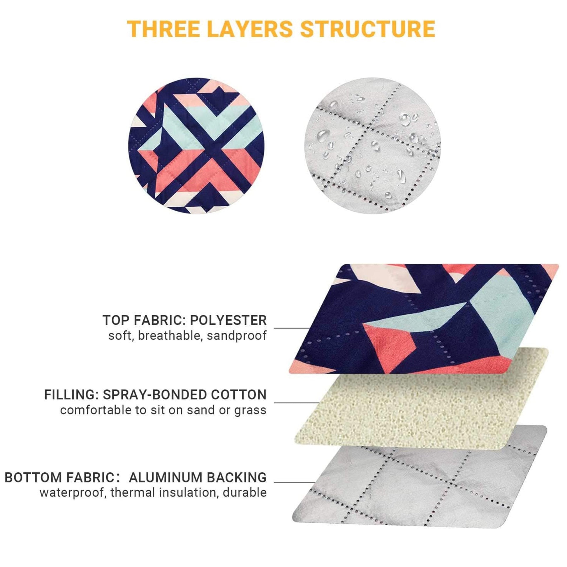 Ideal for picnics, beaches, parks, camping, travel, and sporting events, this blanket for outside is made of 3 layers of durable material making it a thick blanket for comfy seating. Designed with ultrasonically quilted technology and aluminum films on the bottom makes this throw waterproof. The layers won't slide around or allow water to seep through so even on wet grass, you won't feel uncomfortable. Whether sleeping or sitting on the picnic blanket, you will enjoy great comfort thanks to the middle's spray-bonded cotton construction for warmth retention.