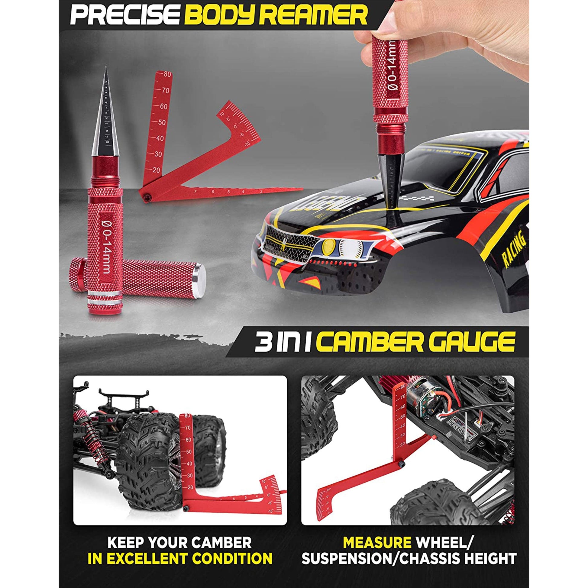 - 3-in-1 camber gauge lets you measure your RC car height and wheel rim camber