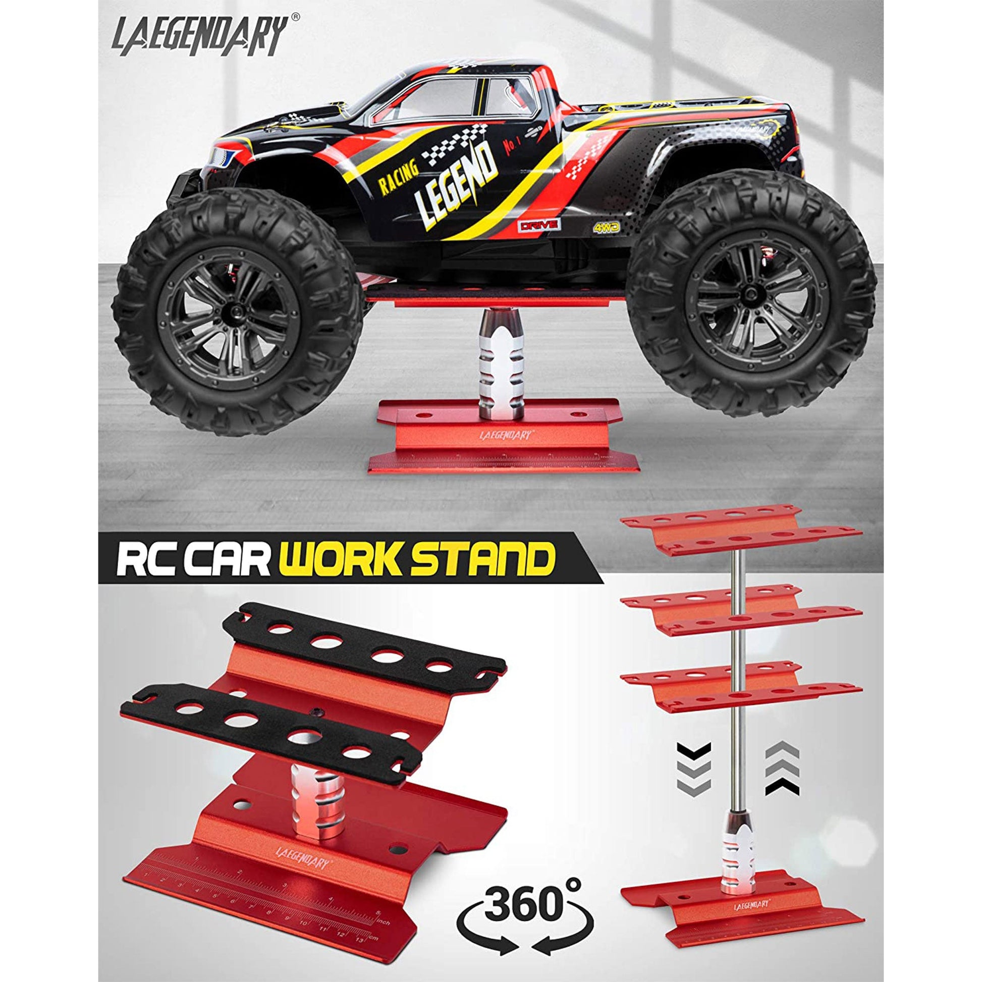 - Stand is compatible with 1:8 to 1:18 scale; Features 360-degree rotation, adjustable height, and built-in holes for rebuilding shocks