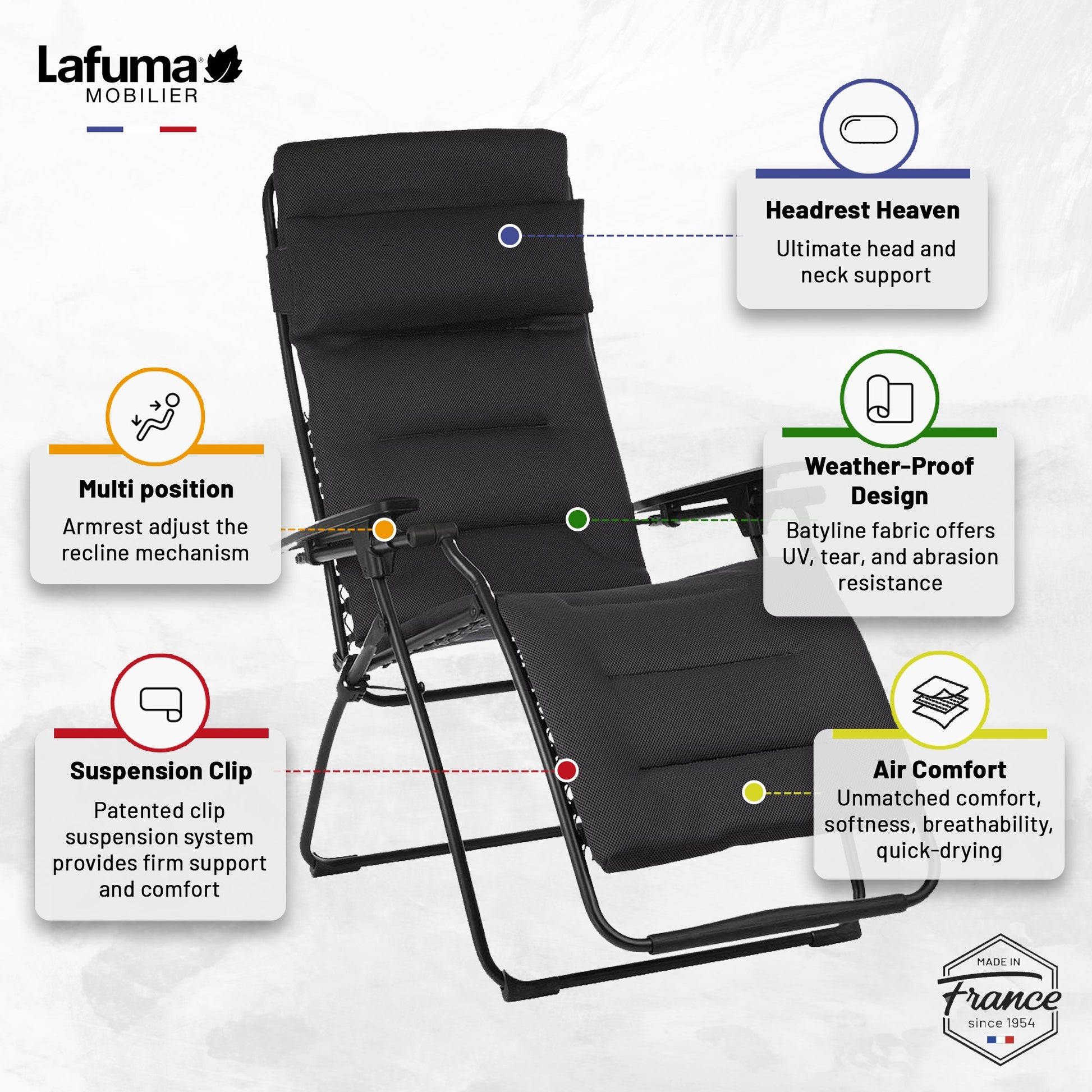 Alleviate pressure on your back, neck, and heart by simply lying back in your Lafuma Futura Air Comfort Reclining Chair.