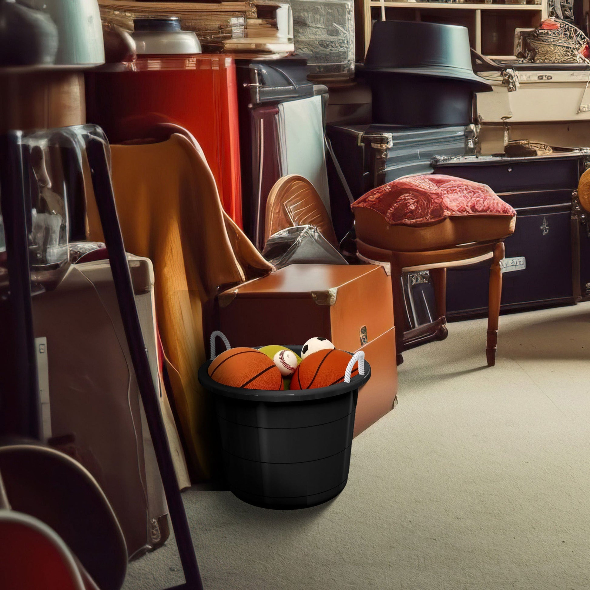 Declutter your garage, attic, kid's room, and more with this 8-Pack of Life Story 17-Gallon Flexible Plastic Storage Buckets with Rope Handles in Black.