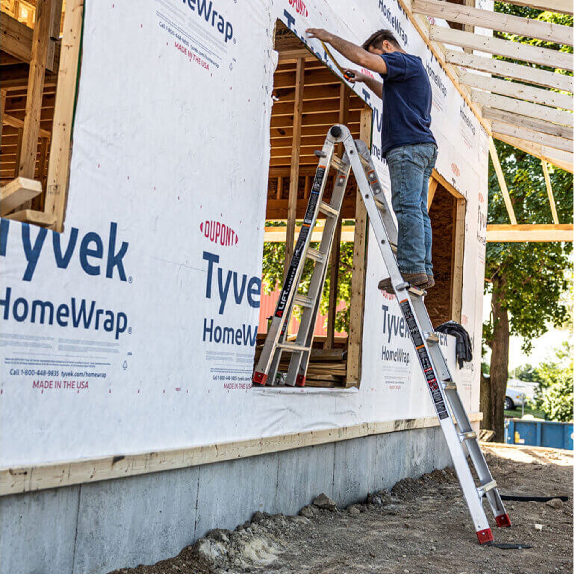 Engineered with an ANSI Type 1AA Duty Rating, it's the epitome of strength, securely supporting up to 375 pounds. This isn't just a ladder but also 5 ladders in 1, adapting effortlessly to your needs. Equipped with an adjustable-height dual-sided stepladder for those extra hands, it also comes as an extension ladder reaching new heights, a stairway ladder navigating uneven surfaces, a 90-degree wall ladder for precision, and dual scaffold bases for robust support.