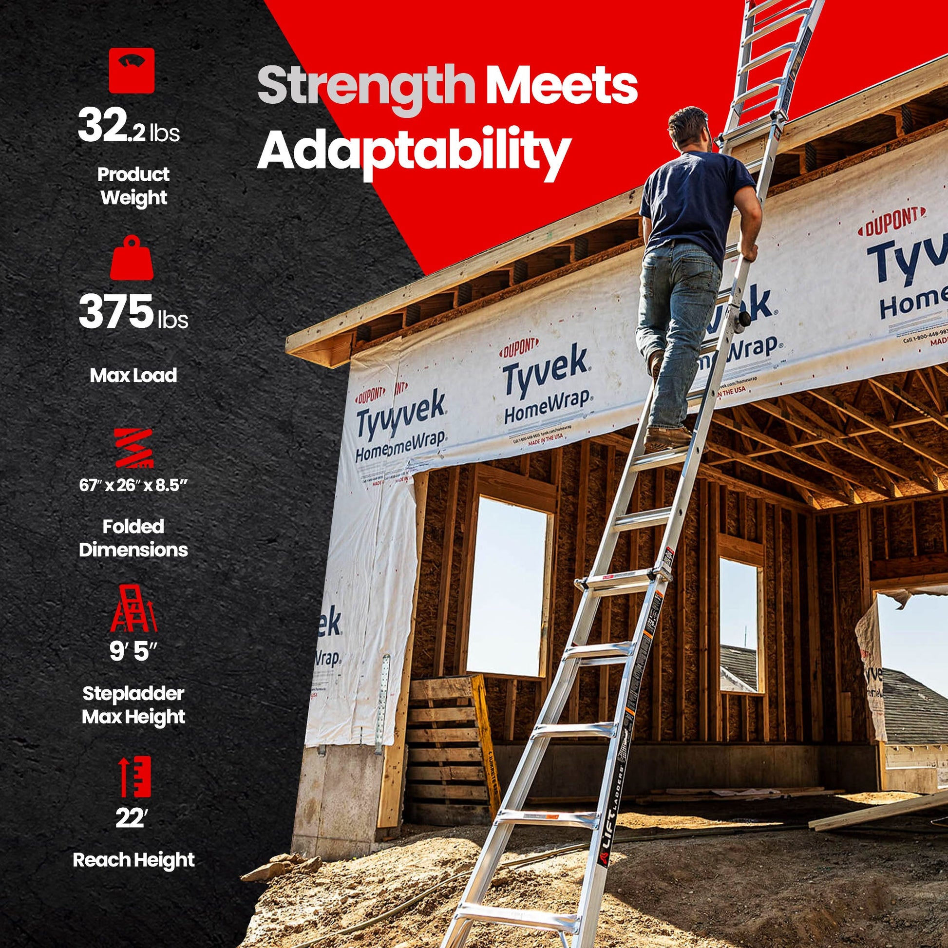 - Extendable heavy-duty yet lightweight aluminum 22-foot ladder providing unmatched support, security, and adaptability