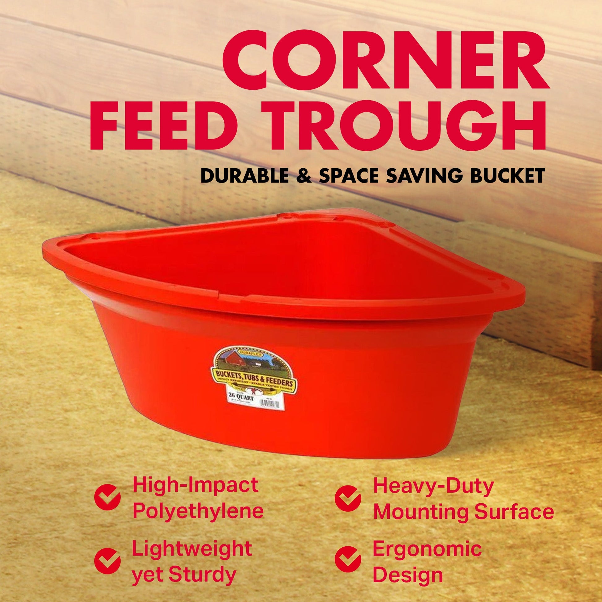 Great for horses, sheep, goats, alpacas, llamas, and other hungry livestock, this versatile feeder holds up to 6.5 gallons of food. Constructed from high-impact polyethylene plastic, this feeding bucket is a durable outdoor bowl that withstands the elements and tough farm use. Keep your herd secure with food-grade material and soft edges that won't snag or cut you and your animals. At the heart of its design is an ergonomic marvel that seamlessly blends convenience with space-saving ingenuity. Embrace the freedom to optimize your surroundings as this bucket effortlessly hangs and mounts into the corner of any space, ensuring that no inch of valuable area goes to waste. Measuring 25.5 inches long, 19.5 inches wide, and 9.75 inches tall, this plastic bin saves space by fitting into any corner. Thanks to the corner placement, this tray is more stable and easily mounts on top of 2 perpendicular rails. For a more permanent setup, purchase and install 4 lag screws. Perfect for various uses, this container holds up to 26 quarts of feed or 6.5 gallons of water. With an open-top design, the low-maintenance dispenser is easy to clean and refill.