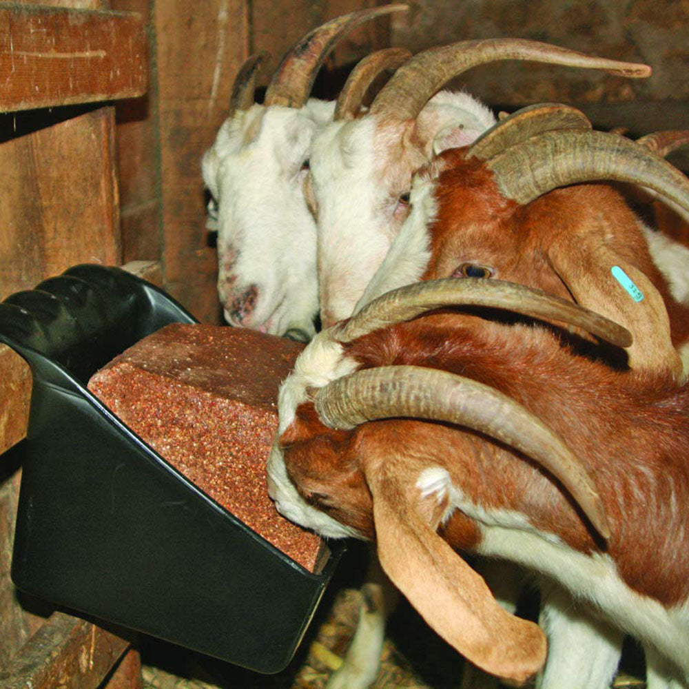 - Universal block holder doubles as a grain or supplement feeder for cattle, horses, goats, sheep, alpacas, and llamas