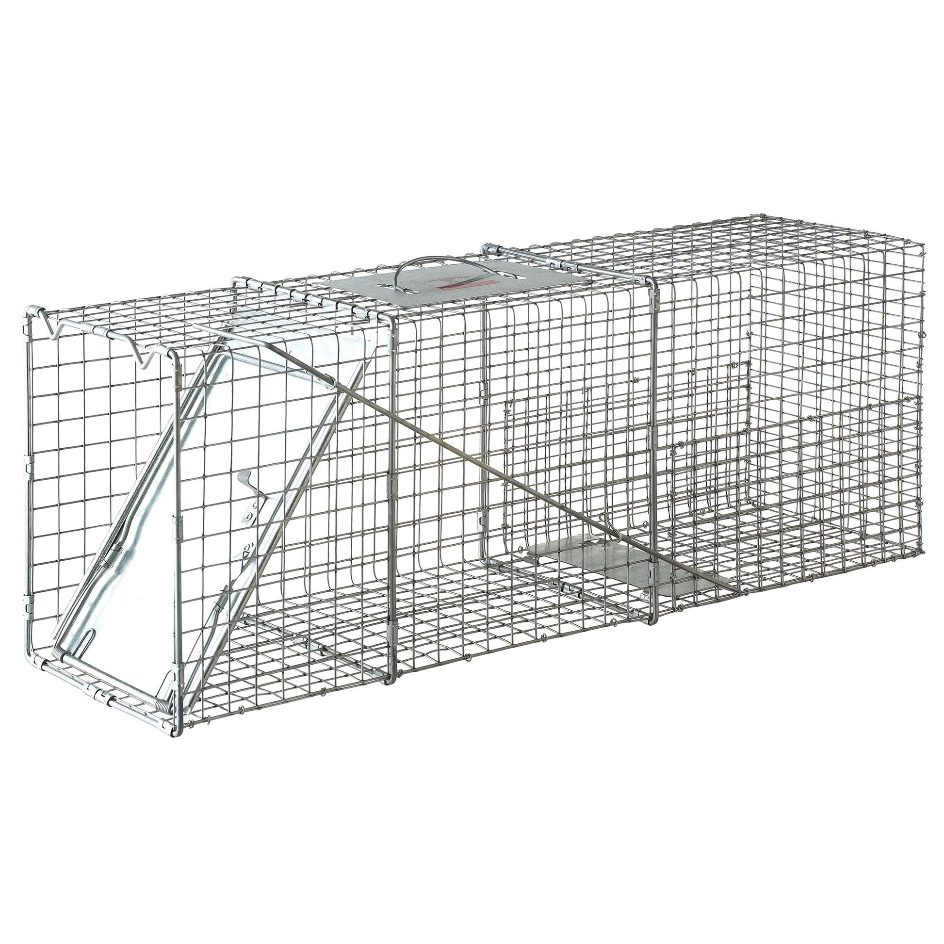 This live animal trap catches animals so they can be humanely disposed of or relocated. The container itself is made of heavy galvanized wire mesh with steel reinforcement that won't buckle when faced with extreme outdoor conditions or aggressive animals. The cage features a spring-loaded door that is easy to bait, set, and quick to release, while the convenient carrying handle provides easy portability. The cage's 32-inch size works great for raccoons, porcupines, turtles, foxes, and other similar-sized animals. This animal trap specifically measures 32.125 inches long by 10.325 inches wide by 12.75 inches high.