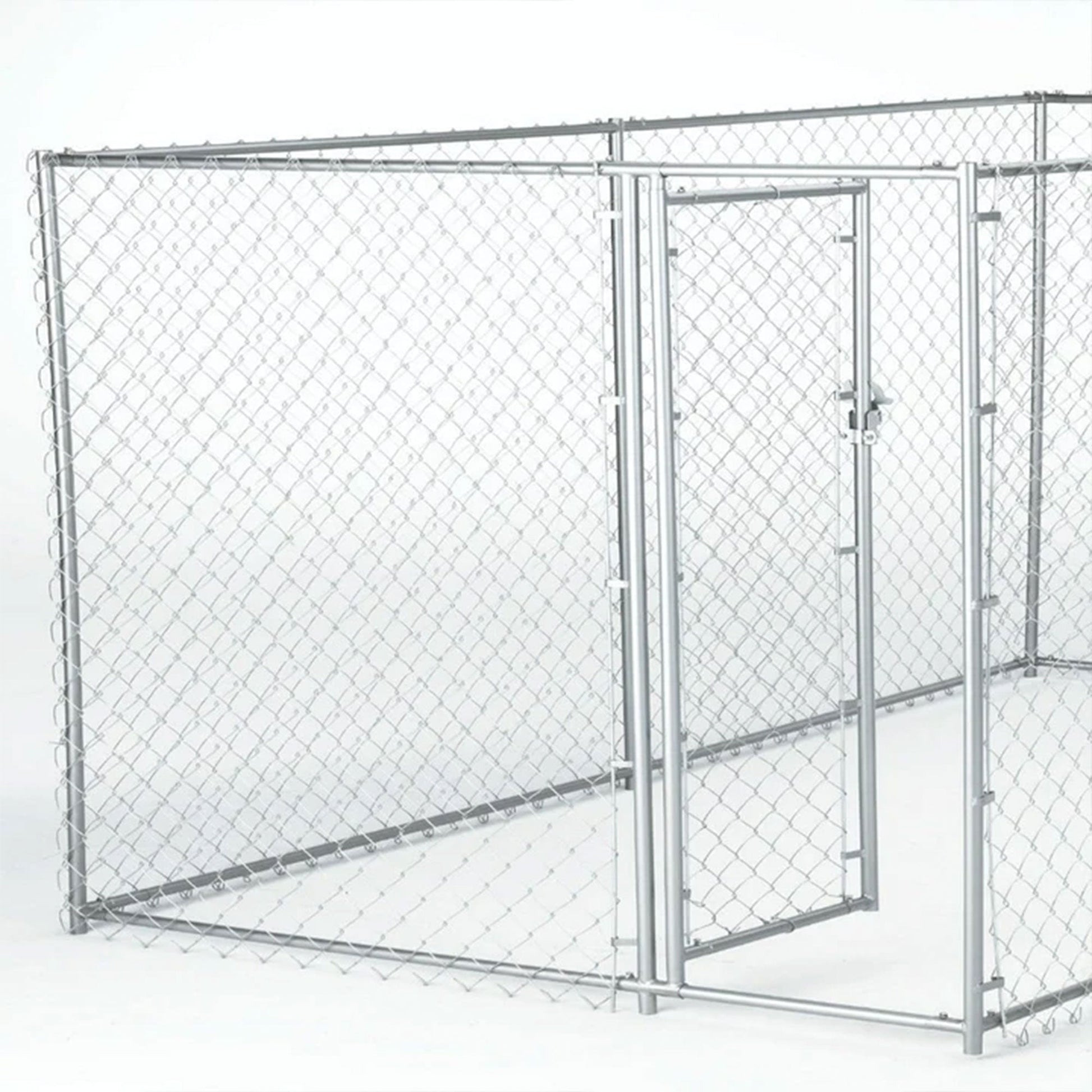 This outdoor dog kennel is functional and flexible with its easy setup for 1 person and 2 design configurations either 10 x 10 foot or 5 x 15 foot. Constructed out of a durable powder coated steel frame with galvanized chain link, this dog playpen is designed to stand up to heavy outdoor use in all kinds of weather. It measures 6 feet in height with a built in door for easy entry and exit, as well as a 1.5 raised leg height so it's easier to sweep or hose out. The welded and coated frame corners cut down on sharp edges, rust, and corrosion over time.