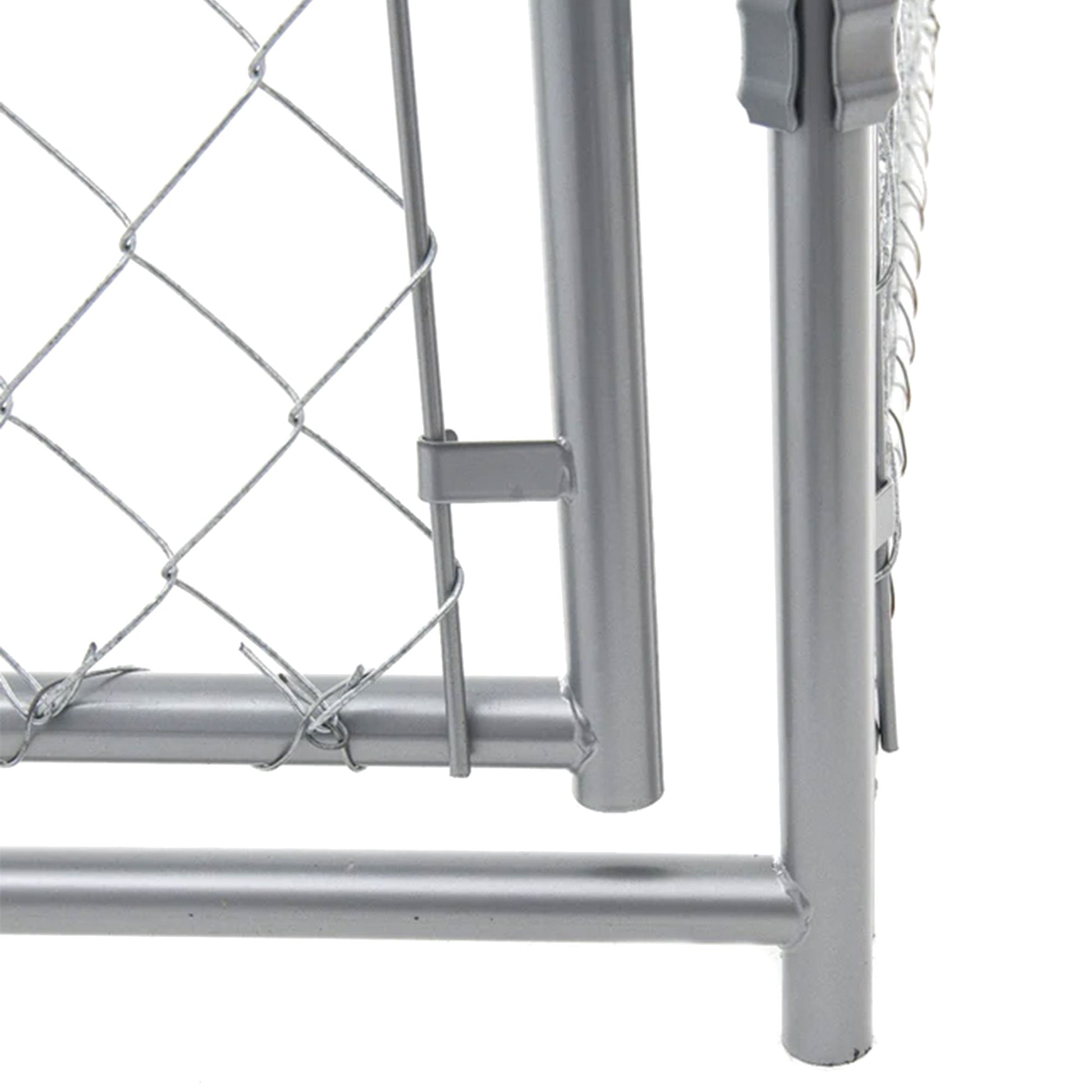 This outdoor dog kennel is functional and flexible with its easy setup for 1 person and 2 design configurations either 10 x 10 foot or 5 x 15 foot. Constructed out of a durable powder coated steel frame with galvanized chain link, this dog playpen is designed to stand up to heavy outdoor use in all kinds of weather. It measures 6 feet in height with a built in door for easy entry and exit, as well as a 1.5 raised leg height so it's easier to sweep or hose out. The welded and coated frame corners cut down on sharp edges, rust, and corrosion over time.
