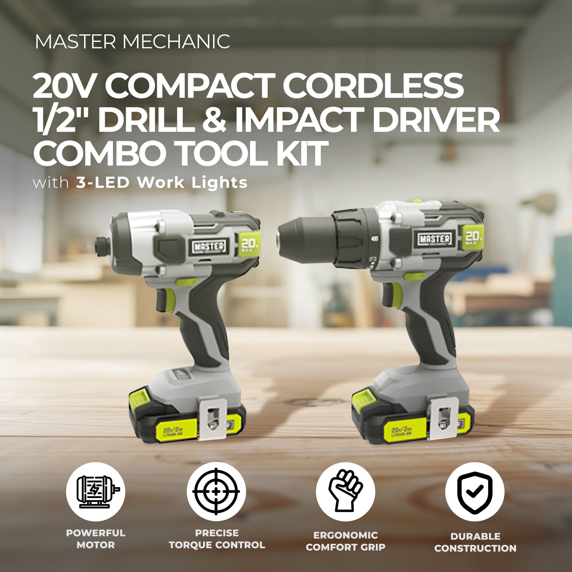 Master Mechanic 20V Compact Cordless 1/2" Drill and Impact Driver Combo Tool Kit