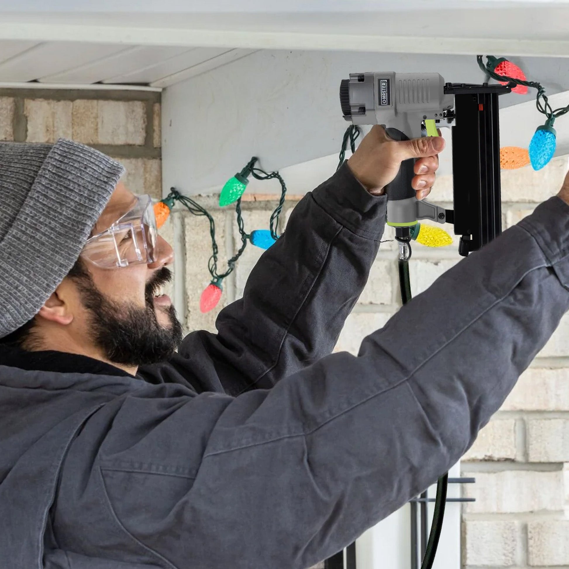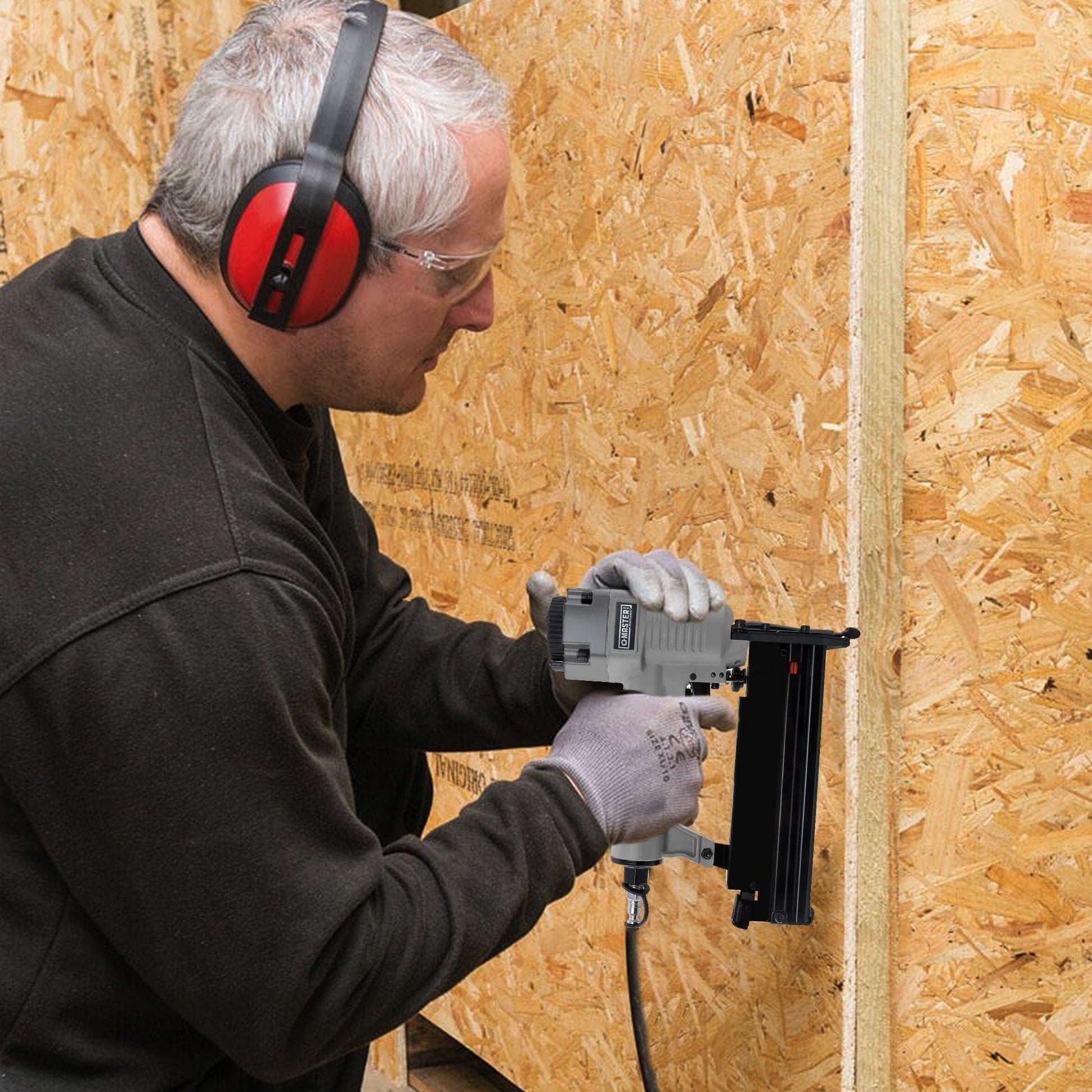 With the capability to drive 16-gauge finish nails, 18-gauge brad nails, and 18-gauge narrow crown staples, this adjustable tool is ideal for a wide range of applications, including shoe and crown moldings, baseboards, furniture trim, window casings, and chair rails. Crafted with durability in mind, this nailer features an aluminum magazine and cylinder, ensuring long-lasting performance even in demanding work environments. Coming with 360-degree adjustable exhaust this stapler allows for precise control of airflow, while the no-mar tip protects delicate surfaces from unsightly marks and damage. Equipped with a tool-free depth adjustment mechanism, this nailer/stapler offers hassle-free customization to suit the thickness of various materials, providing optimal results every time. Operating within a pressure range of 60 to 115 psi and boasting a magazine capacity of 100 pieces, this stapling essential ensures efficient and uninterrupted workflow.