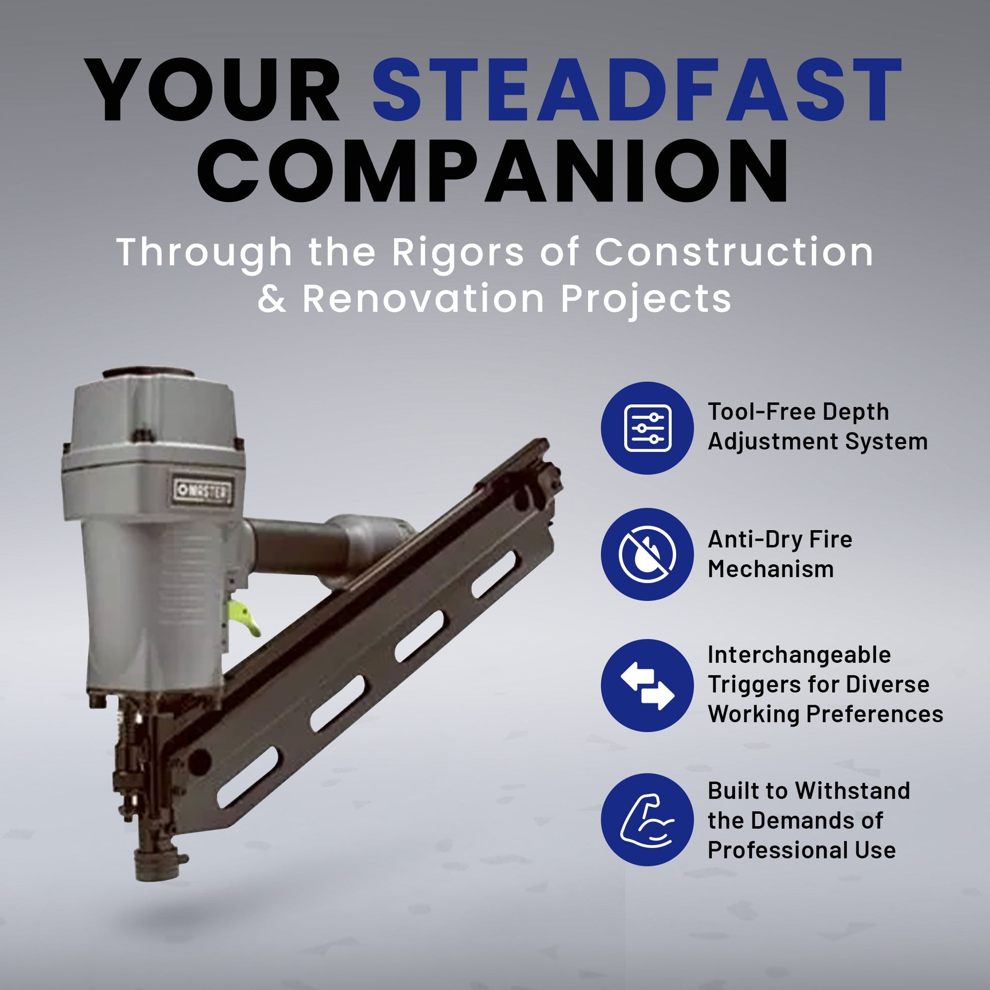 Witness the wonders of unparalleled efficiency and precision with the Master Mechanic Pneumatic 34-Degree Clipped Head Paper Collated Framing Nailer.