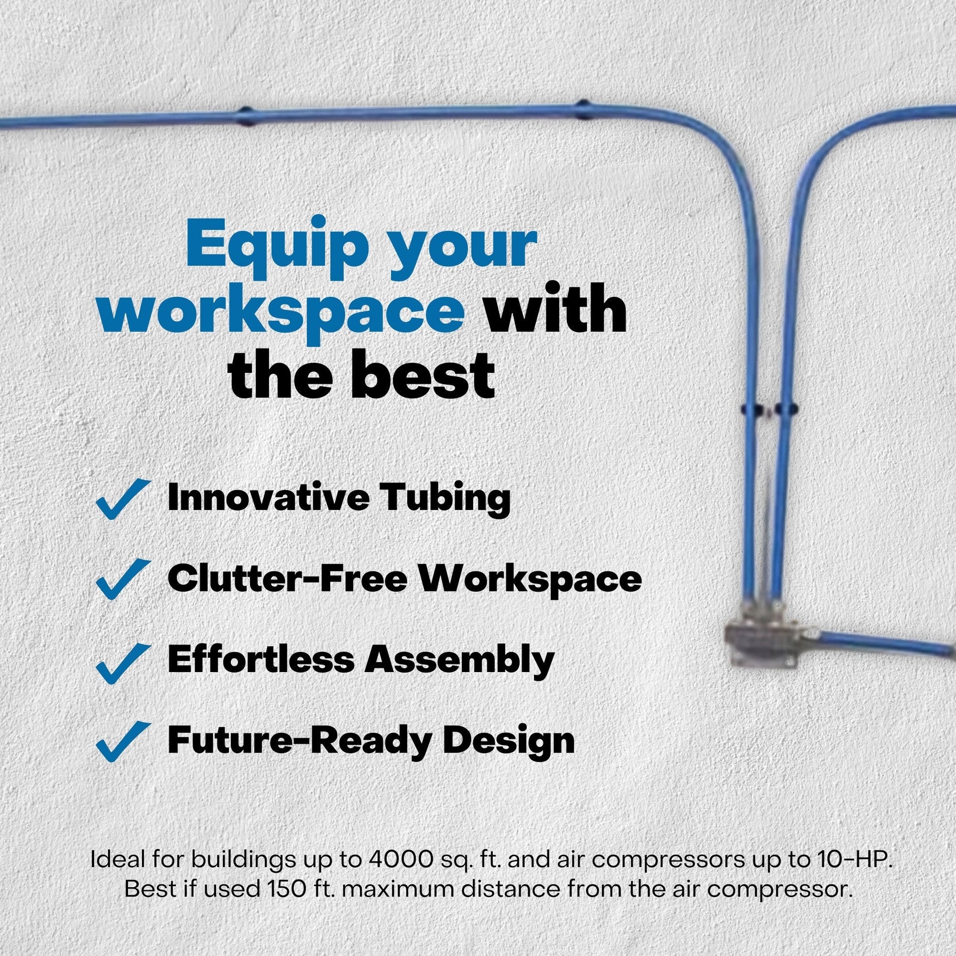 - Includes: 300 feet of 0.75-inch tubing, (3) air outlet kits, (2) tee fittings, 3/4-inch straight fitting, (20) mounting pipe clips, deburr, and cutter tool
