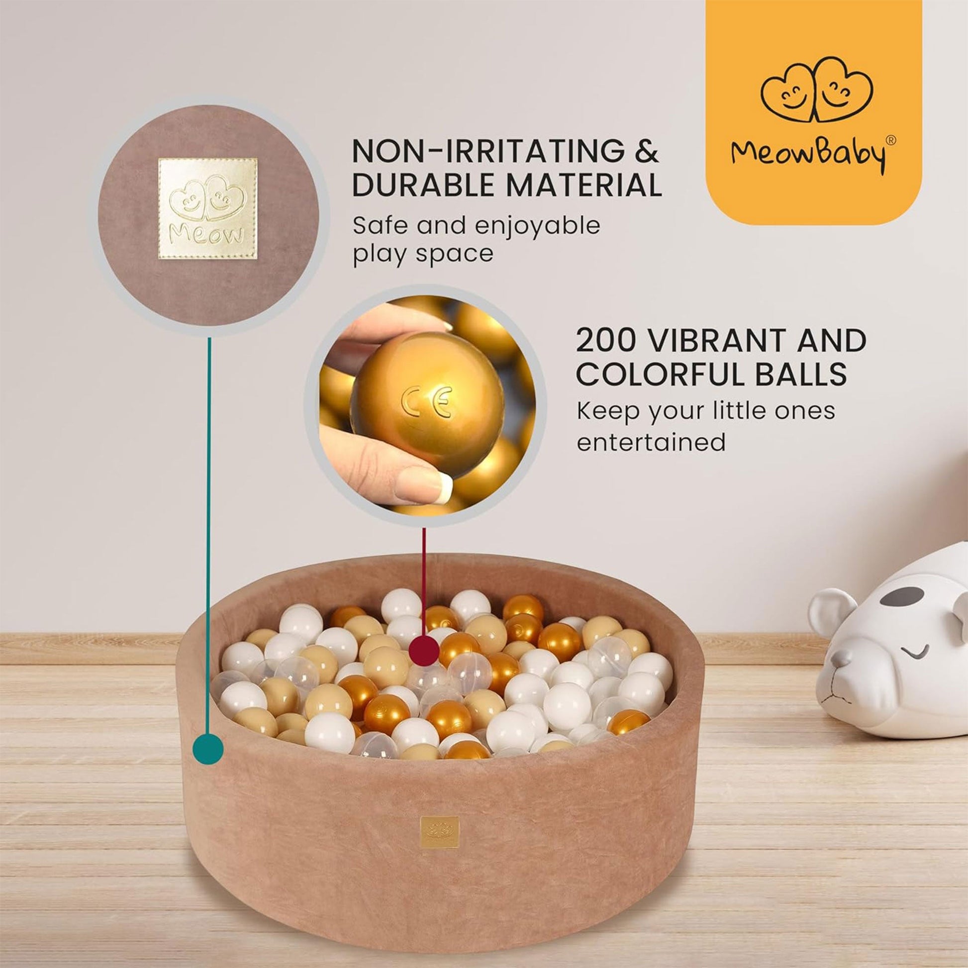 The cases of these ball pits are thoughtfully designed for convenience, featuring a zip fastener for easy access. Plus, this baby ball pit machine washable, allowing for effortless cleaning at a gentle temperature of 87 degrees Fahrenheit. Crafted from a blend of cotton and elastane, the textile is pleasing to the touch, ensuring a cozy play environment. With a diameter of 2.75 inches, these balls for a ball pit are perfectly sized for small hands to grasp and play easily. Shiny, flexible, and non-toxic, these balls are designed to withstand hours of play without cracking or emitting any unpleasant odors.