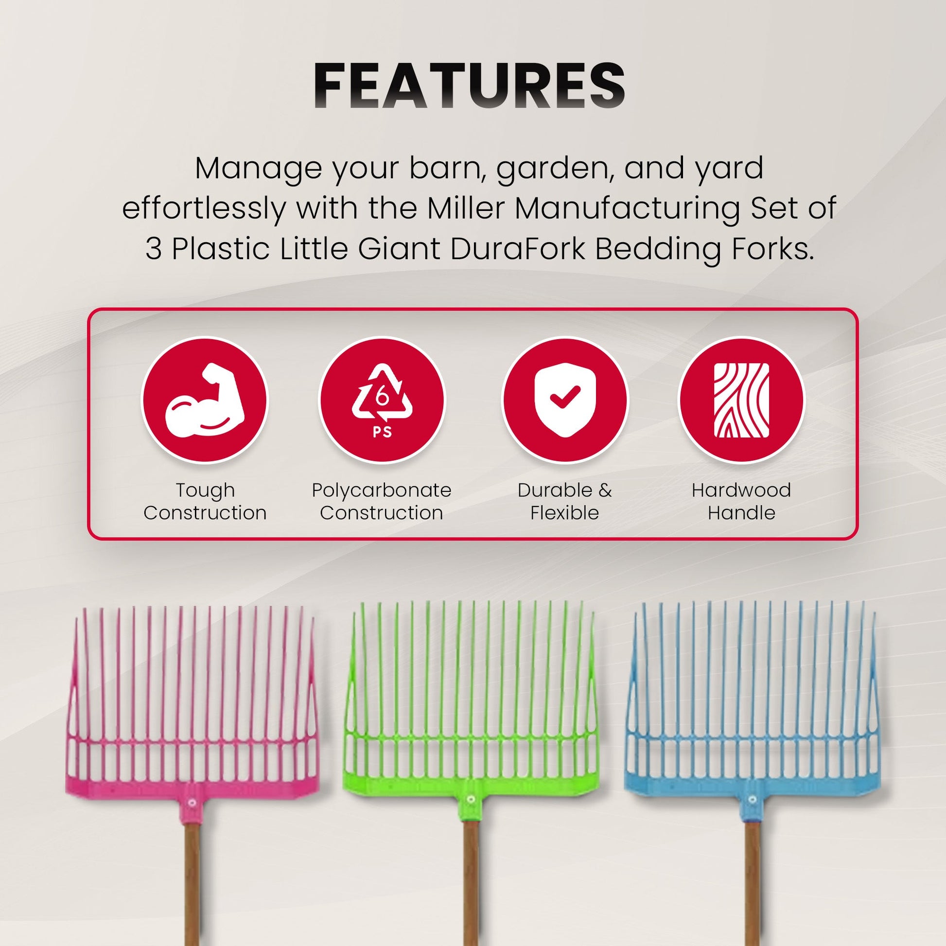 Take control of your barn, garden, and yard with the Miller Manufacturing Set of 3 Plastic Little Giant DuraFork Bedding Forks.