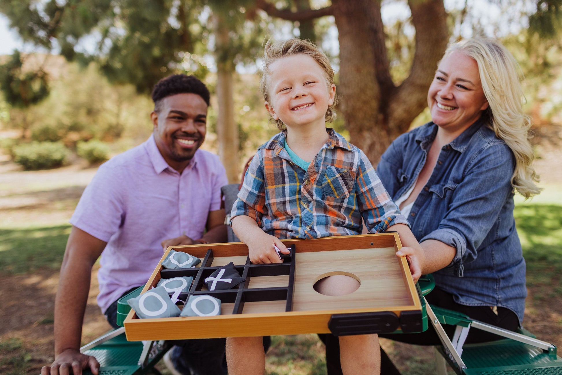 Meet me in the yard - it's going down! Family and friends who play together and stay together with the Picnic Time Mini Bean Bag Throw Game, a double-sided, laminated wood party game board with cornhole on one side and tic-tac-toe on the other. Finally, you can get your game on with the whole family while soaking up that vitamin D. Includes four black bean bags with "X" and four gray bean bags with "O." Easily sets up in ten seconds, and then your tailgate game/picnic enhancer is ready to go. This portable outdoor cornhole game provides hours of fun for adults and kids alike. It's a perfect beach game for the family too!