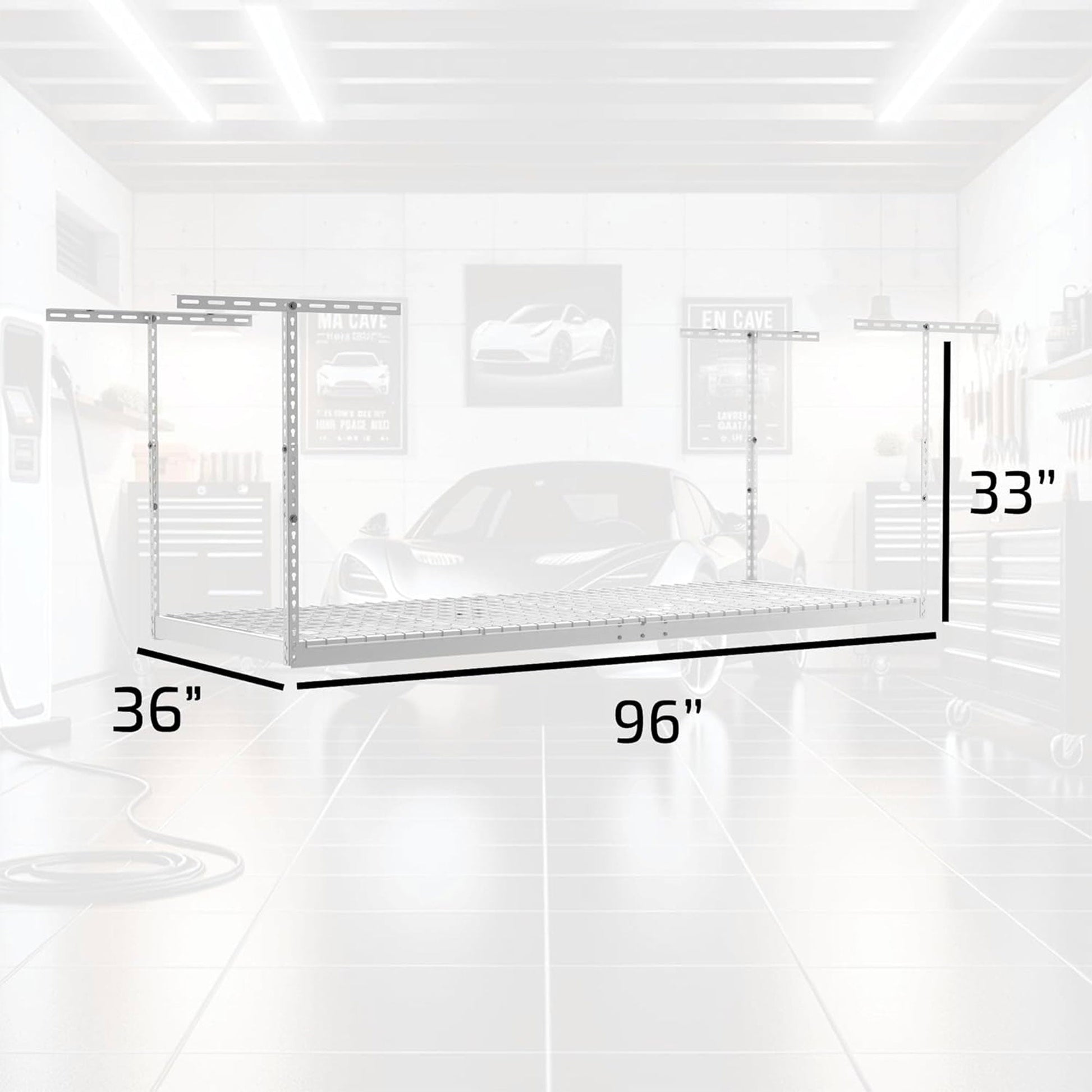 - Overhead garage storage rack tailored to fit seamlessly into any garage space, this 3 by 8-foot storage rack offers versatility and practicality