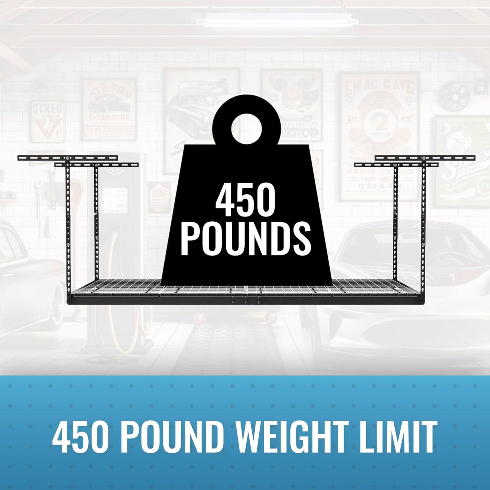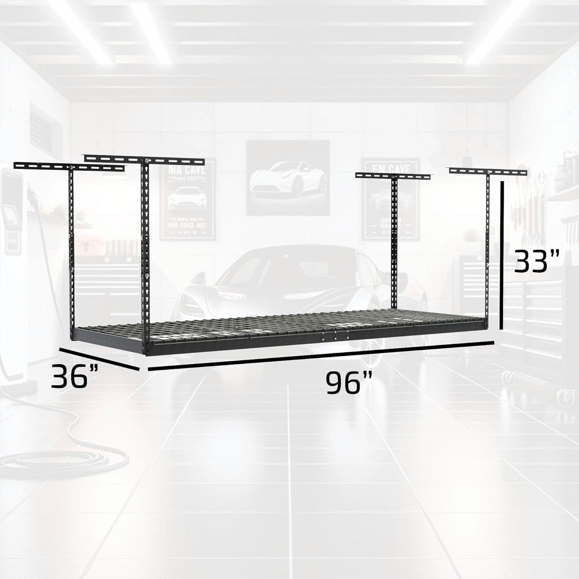- Overhead garage storage rack tailored to fit seamlessly into any garage space, this 3 by 8-foot storage rack offers versatility and practicality
