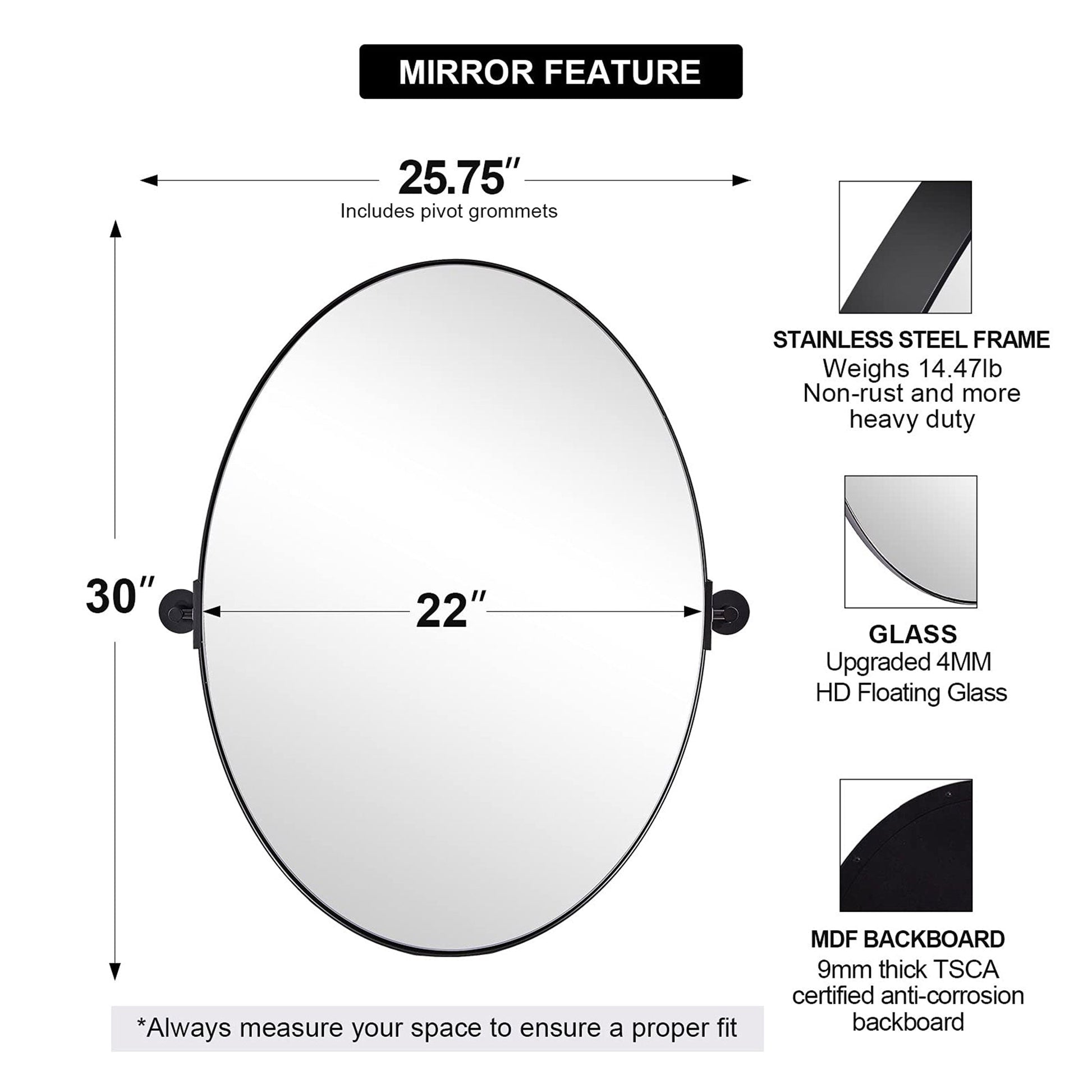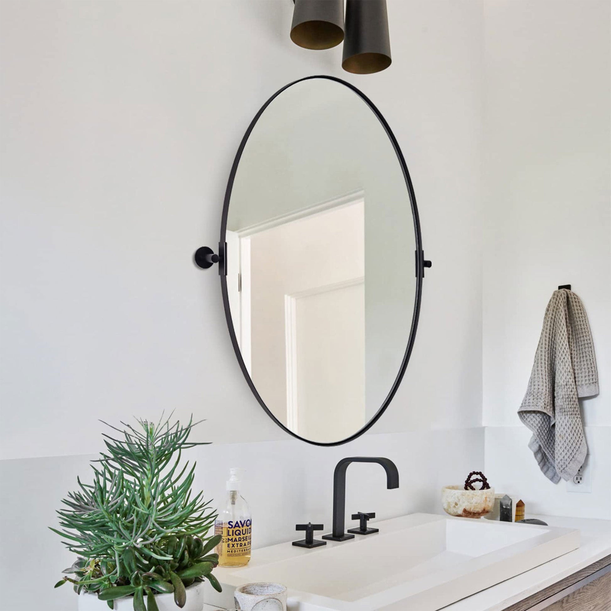 This oval-shaped mirror is sure to bring a sophisticated accent to any living area. Quality is in the details, from a refined matte black finish to precise linework. Enjoy the elegant design with the gap between the frame and glass. A broad oval shape offers increased vertical visibility so you can get an unobscured look at your reflection before the day begins. This mirror is suspended with adjustable rotating clamps for you to tilt and pivot the mirror to view yourself from multiple angles. This modern hanging mirror is rated for use in the bathroom, fireplace, entryway, living room, and bedrooms.