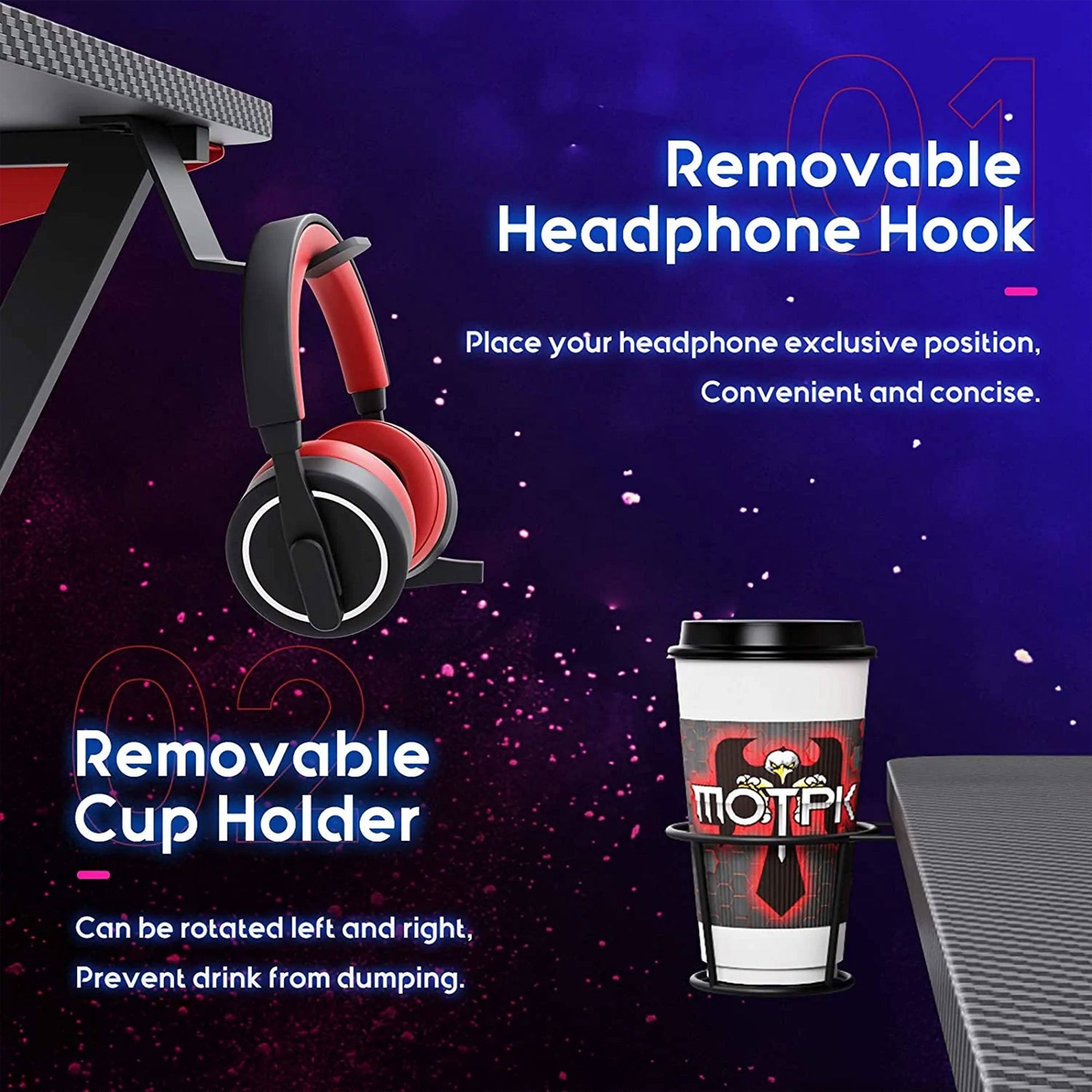 This gaming desk comes with a built-in cupholder and headphone hook for convenience and easy access. It also features cable holes to keep your cords organized and your workspace clutter-free. The desk is supported by a robust Y-shaped metal frame, guaranteeing stability even during the most intense gaming sessions.