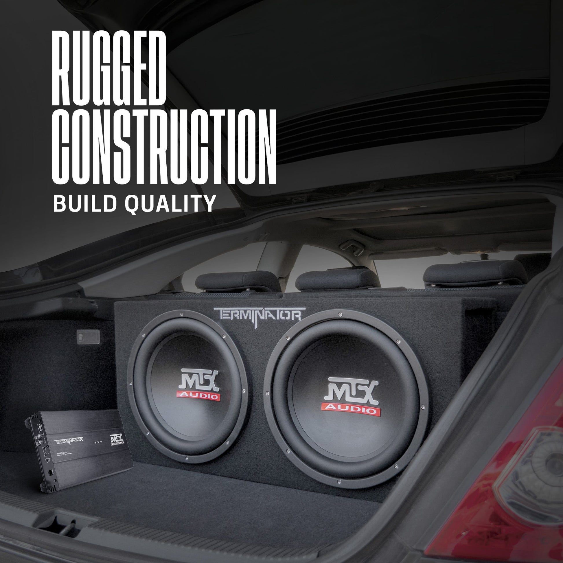 This dual 12 inch vented enclosure has a single terminal cup showing a final 2 ohm impedance load to any connected amplifier. The built in Terminator subwoofers feature durable, light polypropylene dust caps that stand up to the rigors of most trunks while using less power.
