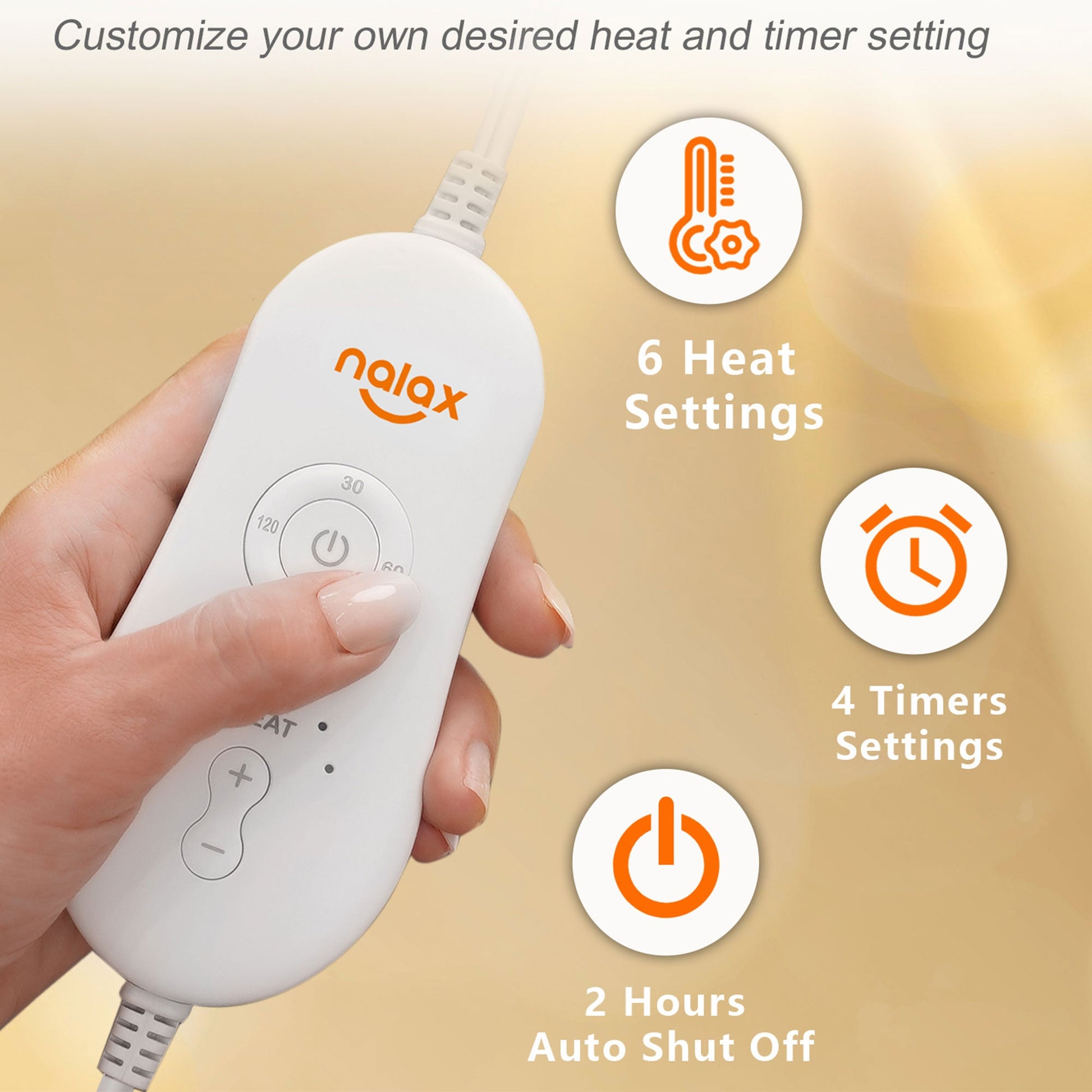 - Includes flexible temperatures with 6 heat settings from 104 to 140 degrees Fahrenheit, 4 timer settings (30 min - 120 min), and 2 hours of auto shut-off and overheating protection