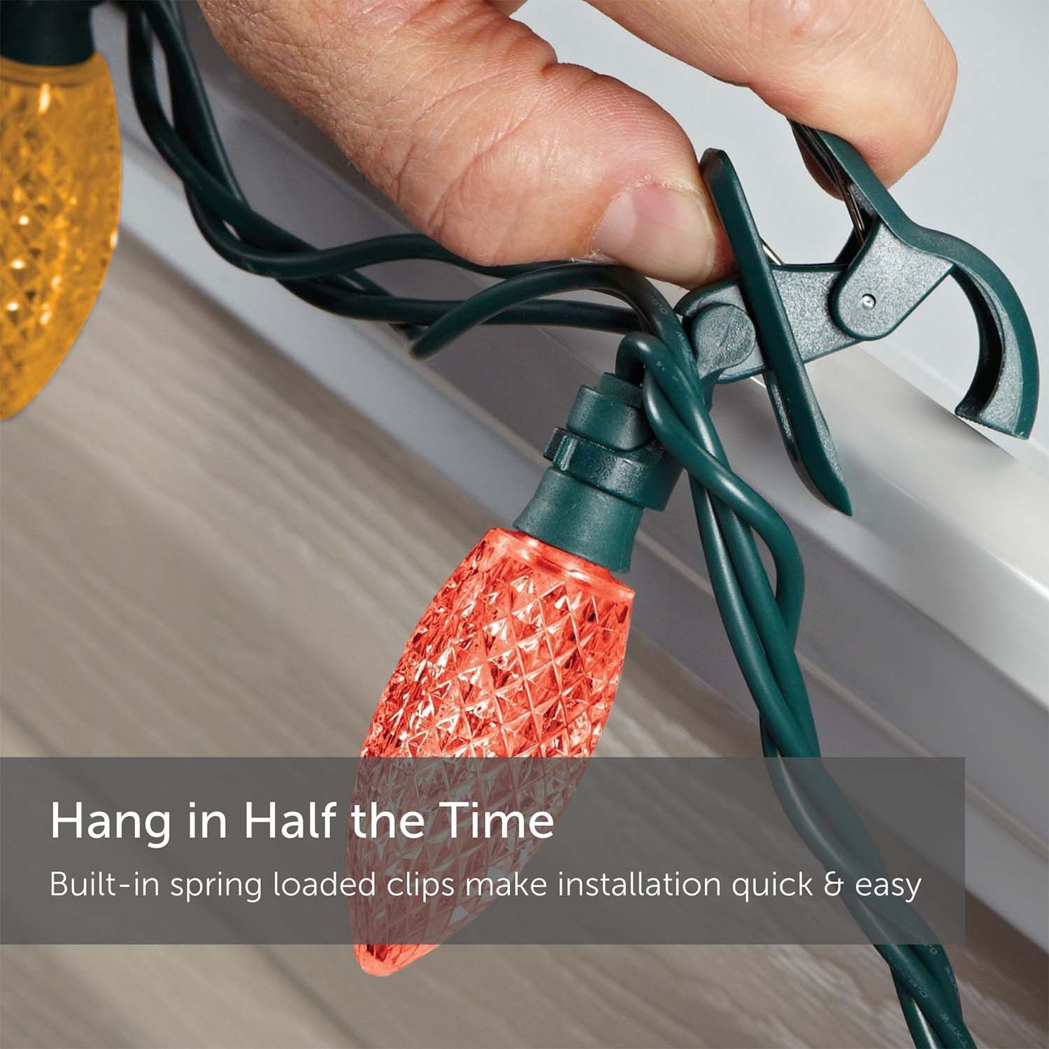 Create a festive and bright atmosphere this holiday season with the Quick Clip String Lights of multi-color LED lights. Designed for convenience, the Quick-Clip technology allows you to decorate your home in half the time, eliminating the need for nails and staples. The spring-loaded clips securely attach to rooflines, branches, and railings, while the high-quality C9 bulbs rotate 180 degrees so you can easily adjust each light to your desired position.