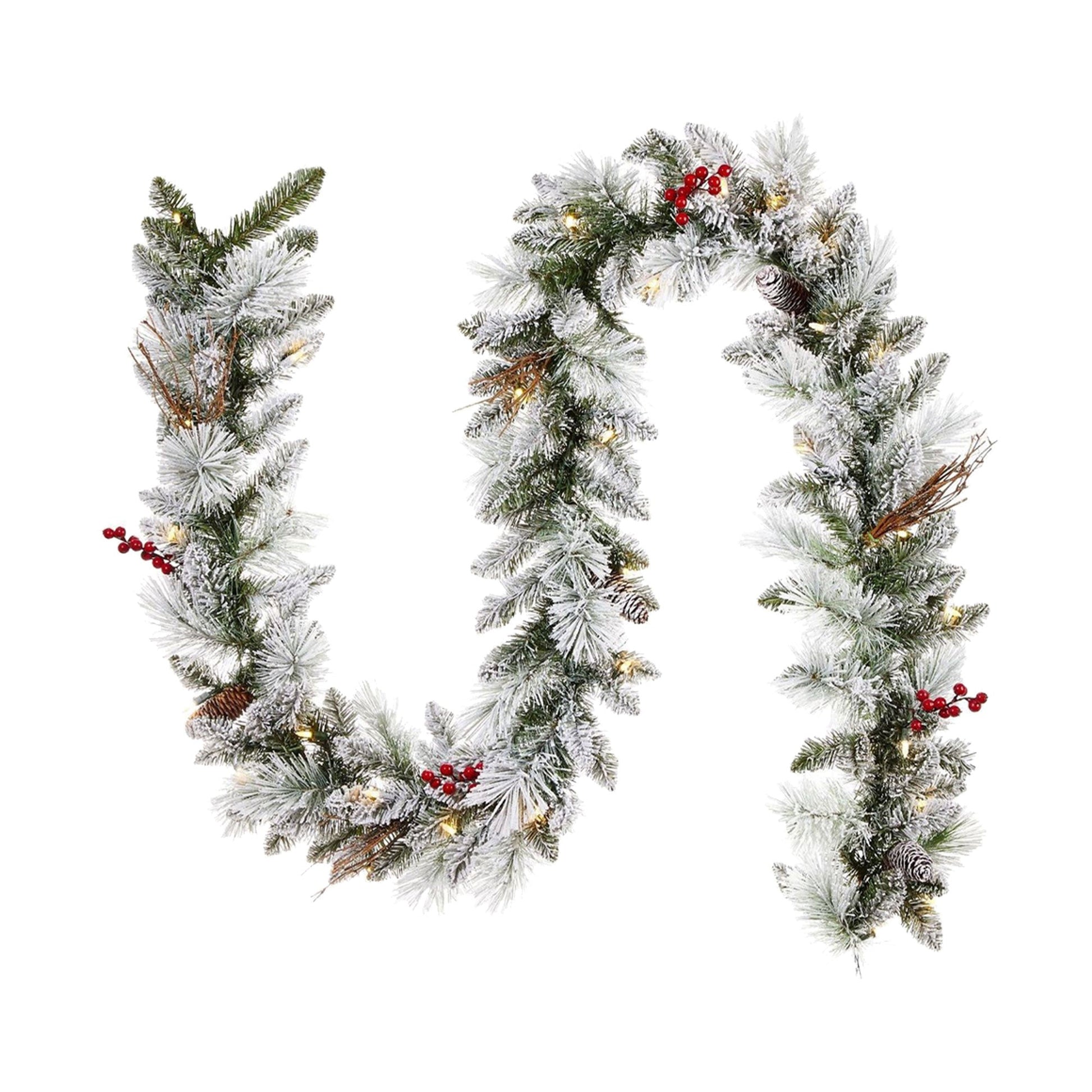 - Enhance the look of your holiday decorations with this set of 2 realistic and pre-lit Christmas garland strands that recreate the enchantment of a snow-covered forest with its lifelike design and intricately placed snow-dusted berries