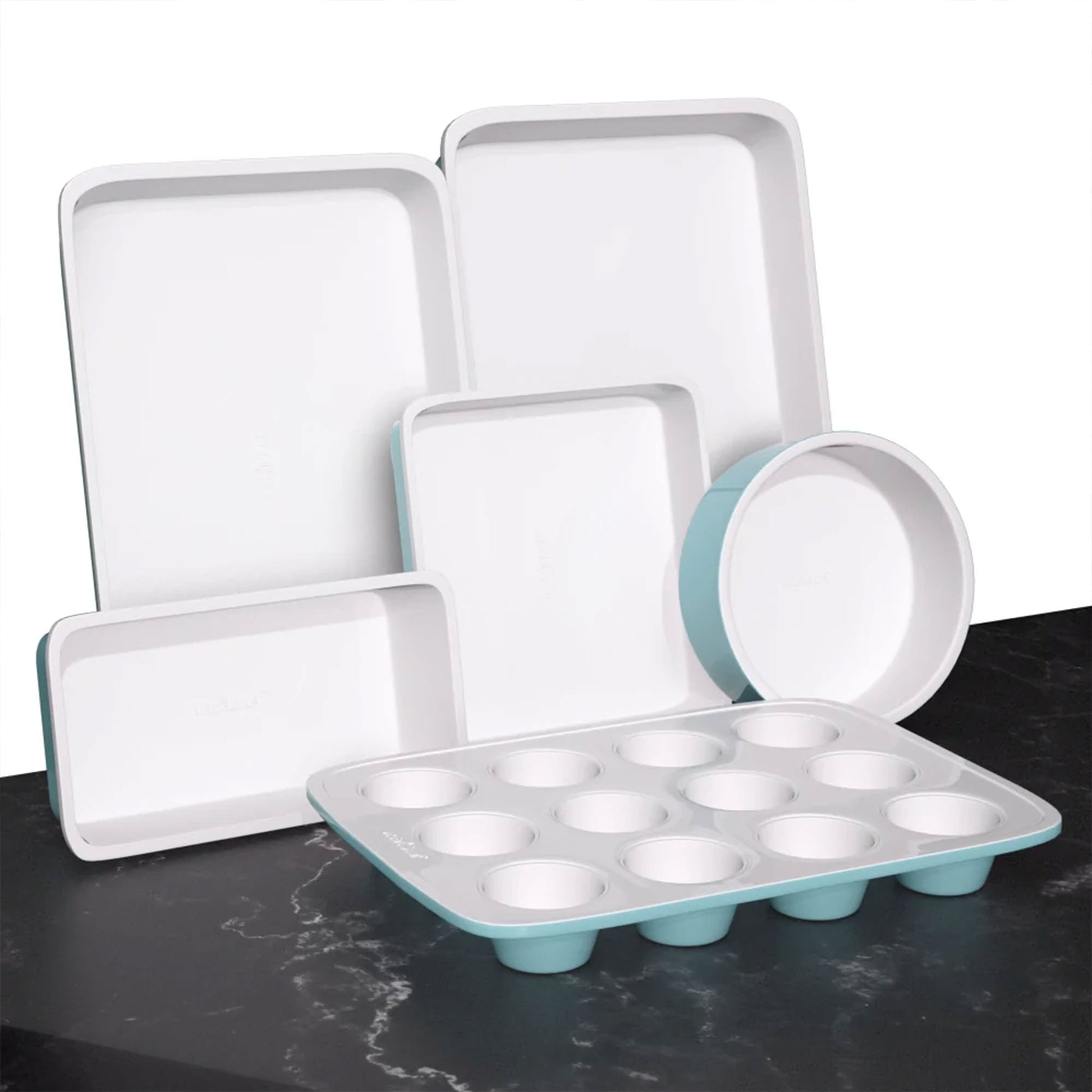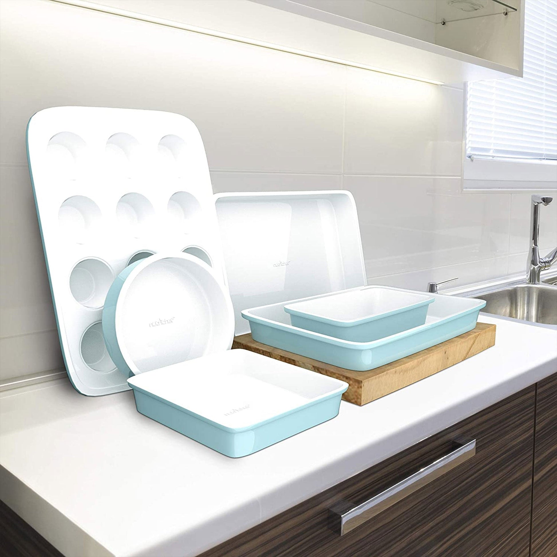 Get ready for your own great bake-off with the NutriChef 6 Piece Ceramic Baking Pan Set. Each piece is constructed of carbon steel and covered in a non-stick ceramic coating. The white interiors nicely complement the vintage green exteriors of each baking pan.