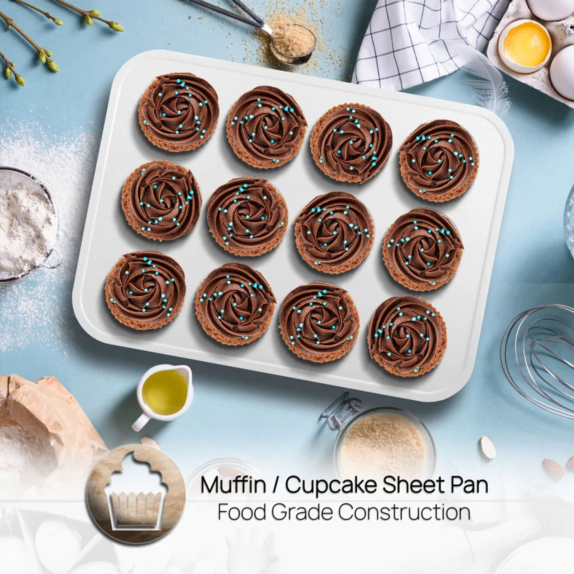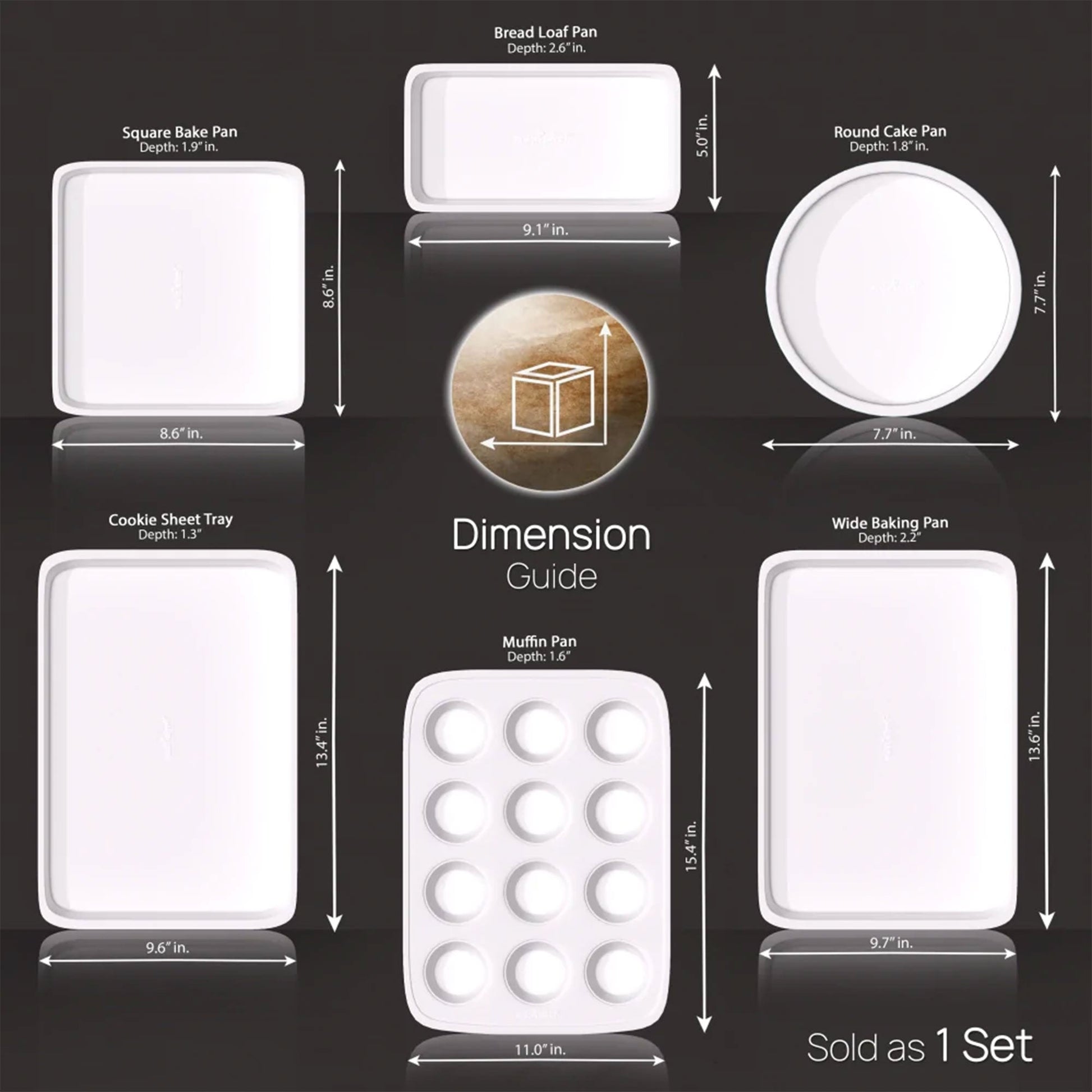 - Includes 1 cookie sheet tray, 1 wide baking pan, 1 square bake pan, 1 oven muffin pan, 1 bread loaf pan, and 1 round cake pan